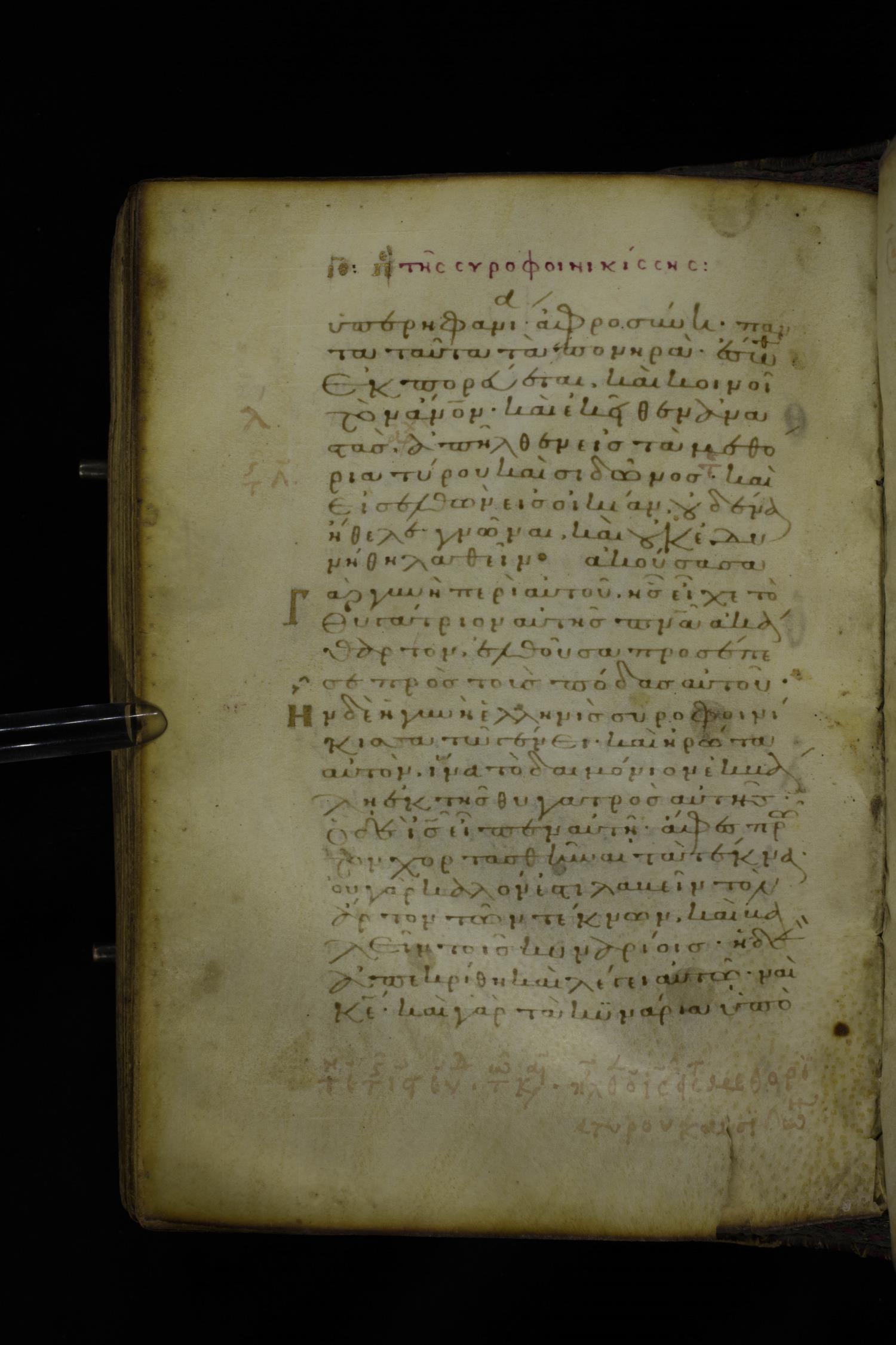 Twelfth century minuscule of the Gospel on parchment; 305 leaves, 1 column, 24 lines per column. Images were taken at the National Library of Greece in Athens.