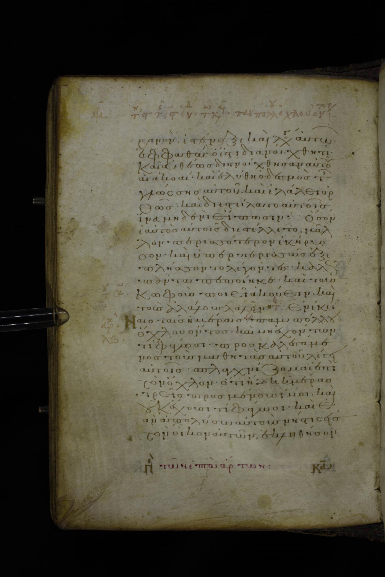 Twelfth century minuscule of the Gospel on parchment; 305 leaves, 1 column, 24 lines per column. Images were taken at the National Library of Greece in Athens.
