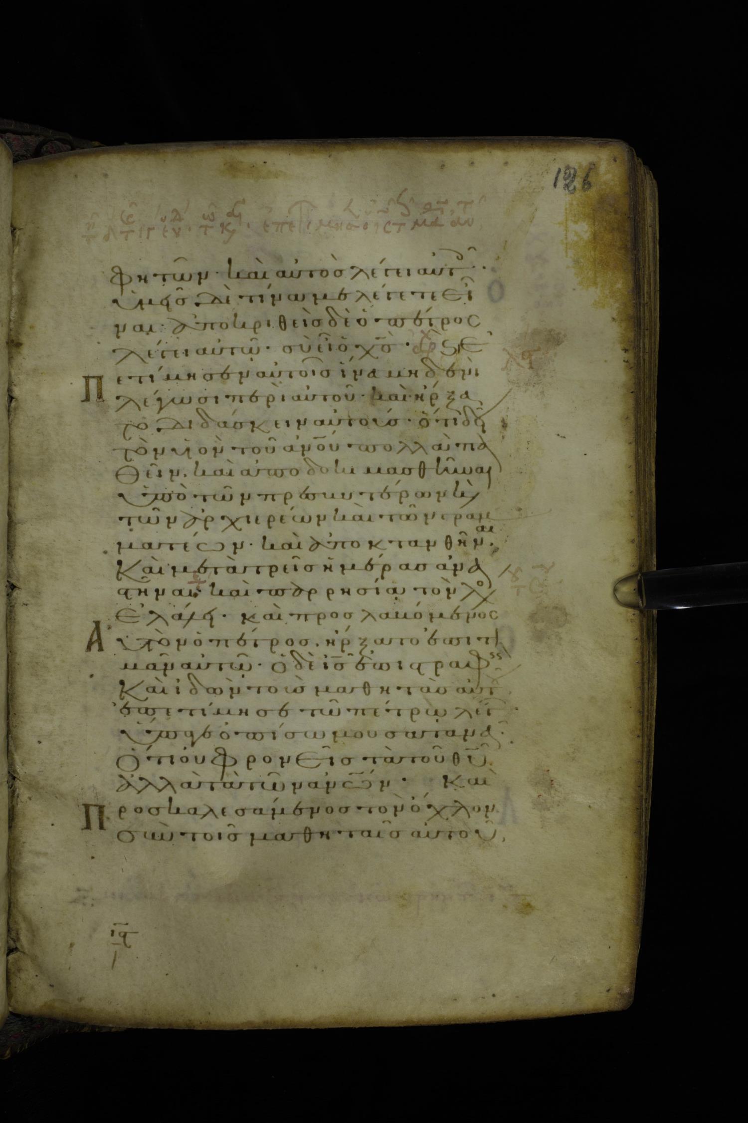 Twelfth century minuscule of the Gospel on parchment; 305 leaves, 1 column, 24 lines per column. Images were taken at the National Library of Greece in Athens.