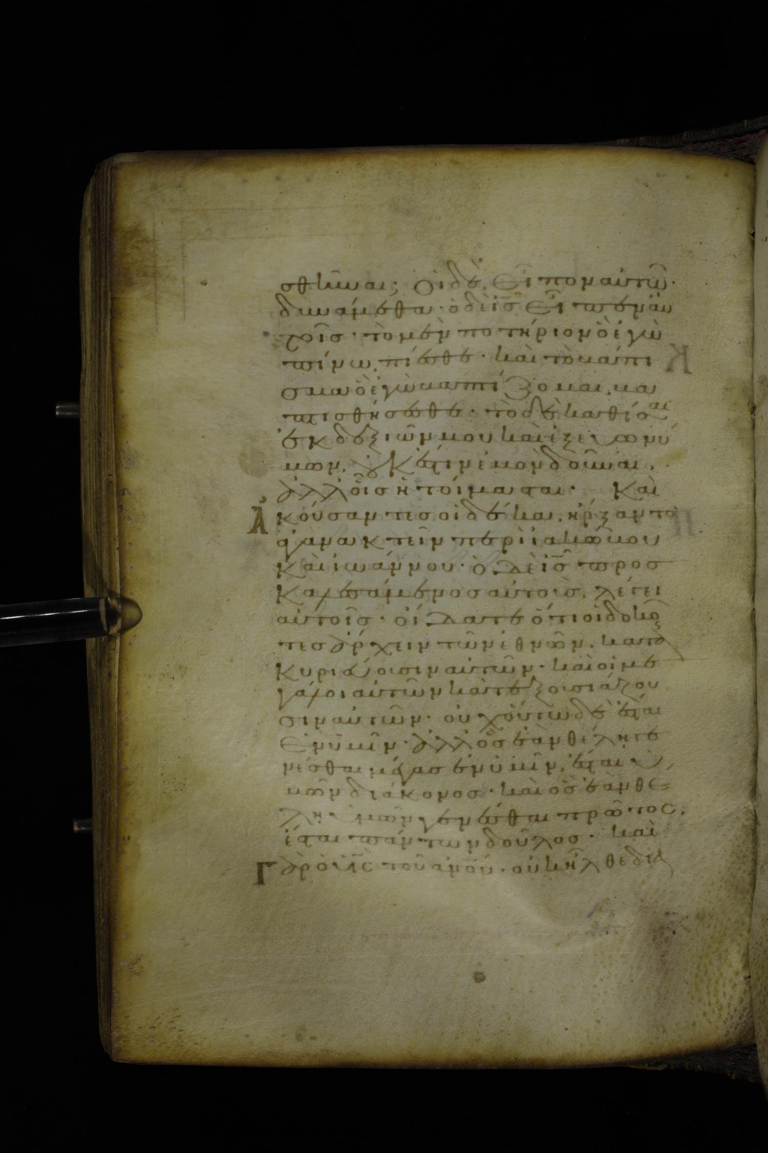 Twelfth century minuscule of the Gospel on parchment; 305 leaves, 1 column, 24 lines per column. Images were taken at the National Library of Greece in Athens.