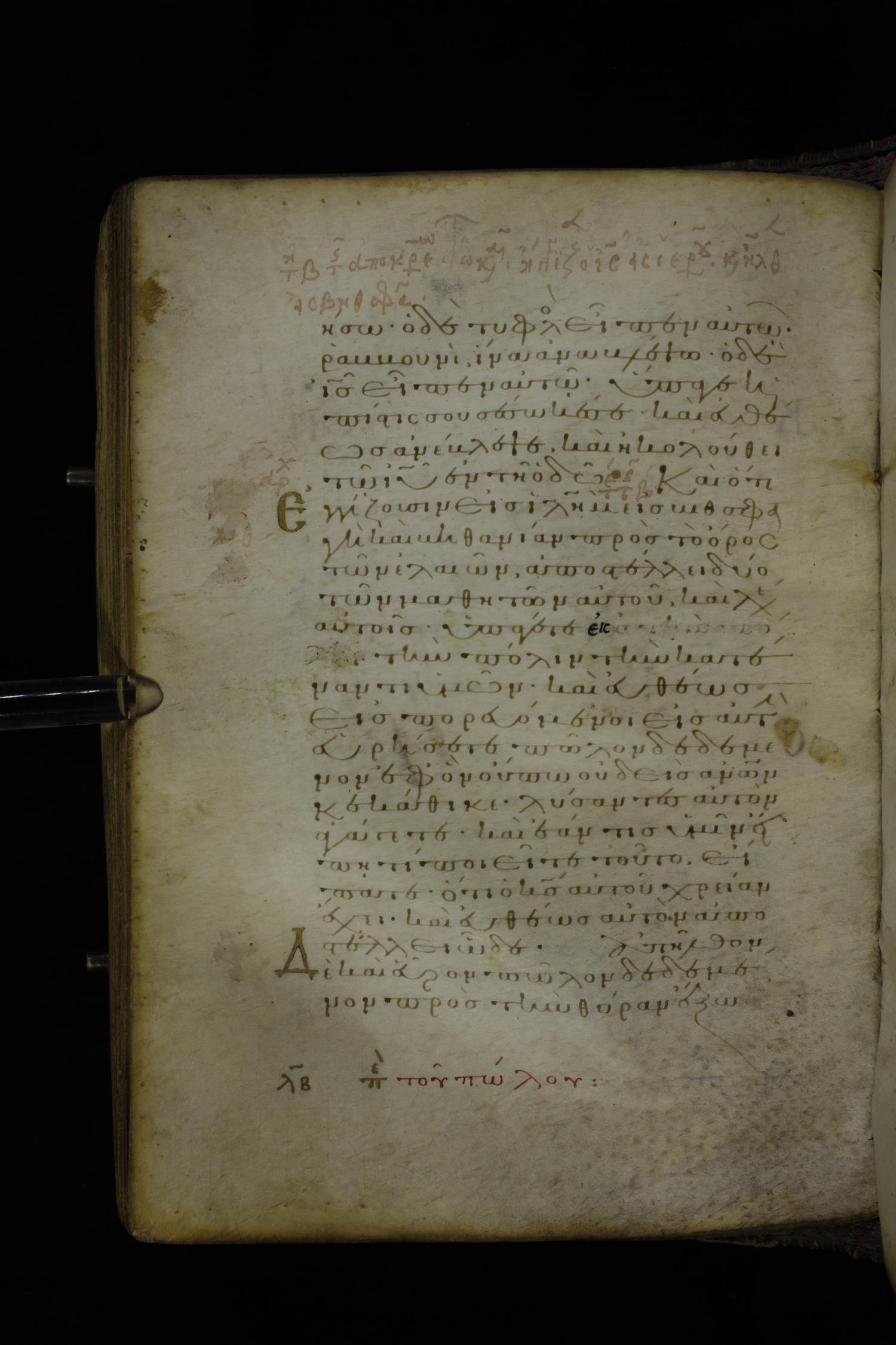 Twelfth century minuscule of the Gospel on parchment; 305 leaves, 1 column, 24 lines per column. Images were taken at the National Library of Greece in Athens.