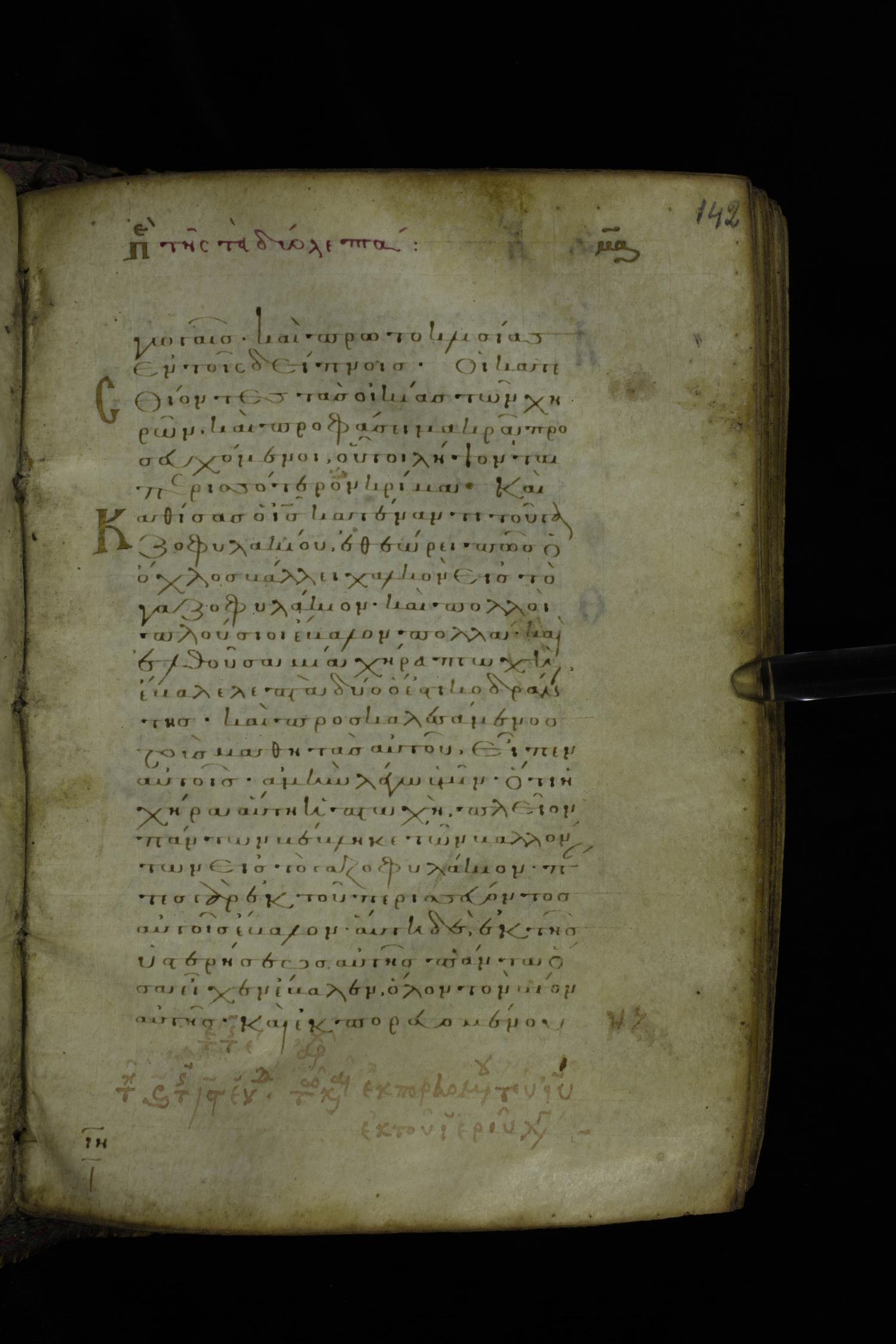 Twelfth century minuscule of the Gospel on parchment; 305 leaves, 1 column, 24 lines per column. Images were taken at the National Library of Greece in Athens.