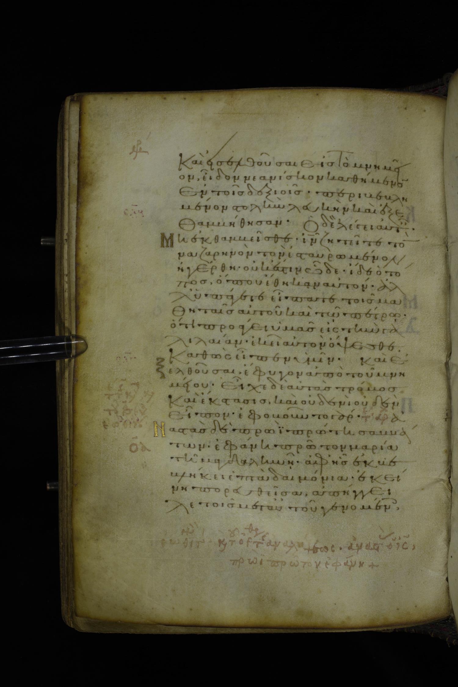 Twelfth century minuscule of the Gospel on parchment; 305 leaves, 1 column, 24 lines per column. Images were taken at the National Library of Greece in Athens.