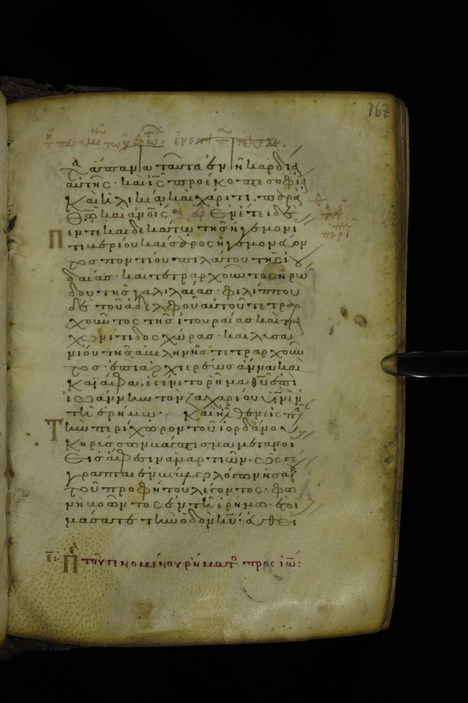 Twelfth century minuscule of the Gospel on parchment; 305 leaves, 1 column, 24 lines per column. Images were taken at the National Library of Greece in Athens.