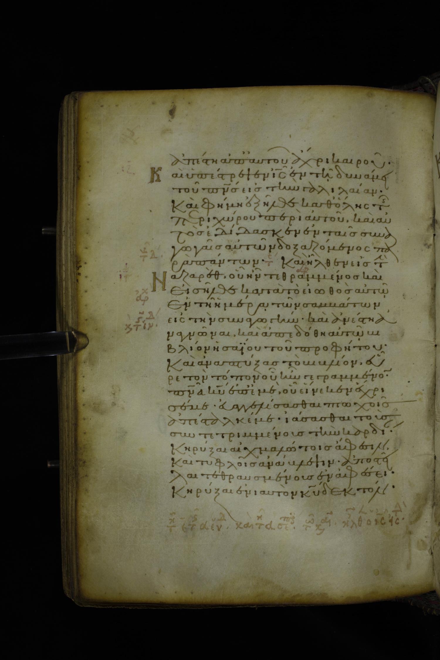 Twelfth century minuscule of the Gospel on parchment; 305 leaves, 1 column, 24 lines per column. Images were taken at the National Library of Greece in Athens.