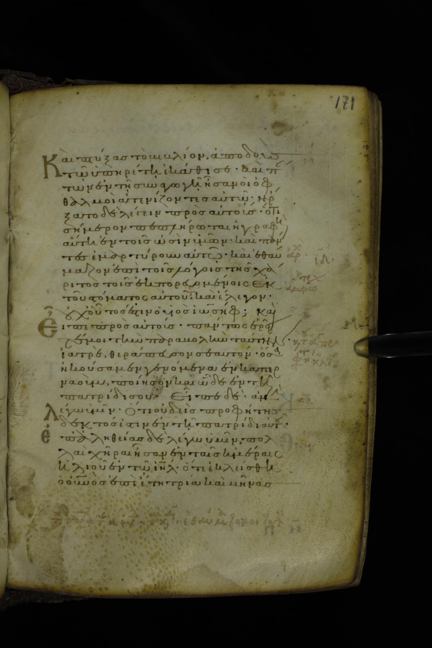 Twelfth century minuscule of the Gospel on parchment; 305 leaves, 1 column, 24 lines per column. Images were taken at the National Library of Greece in Athens.