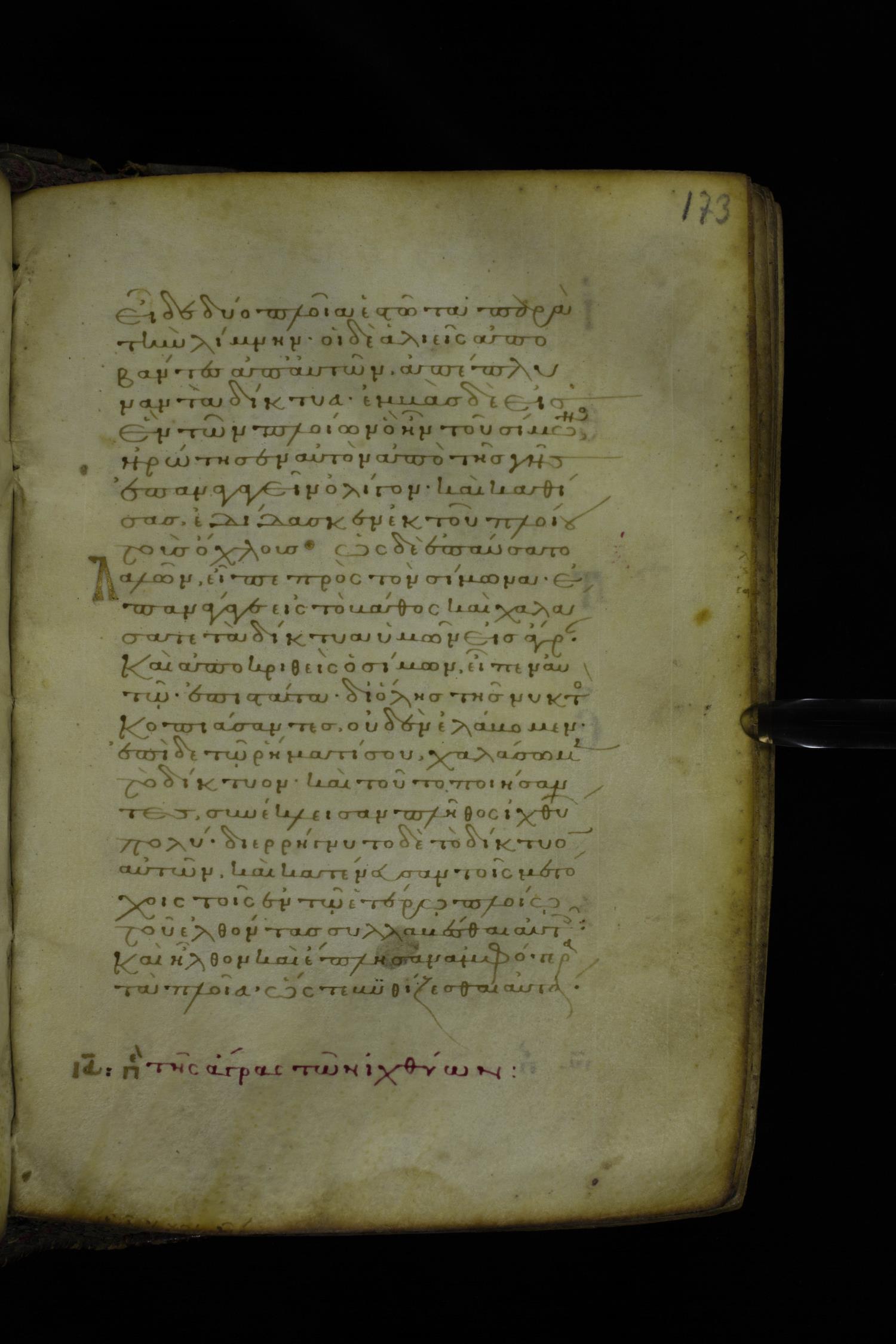 Twelfth century minuscule of the Gospel on parchment; 305 leaves, 1 column, 24 lines per column. Images were taken at the National Library of Greece in Athens.