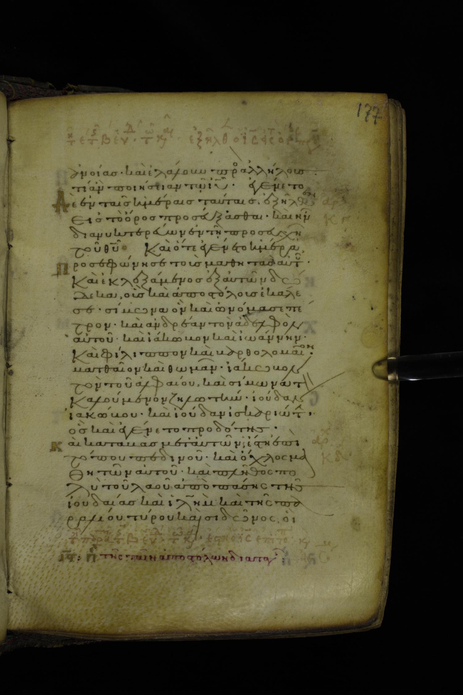 Twelfth century minuscule of the Gospel on parchment; 305 leaves, 1 column, 24 lines per column. Images were taken at the National Library of Greece in Athens.