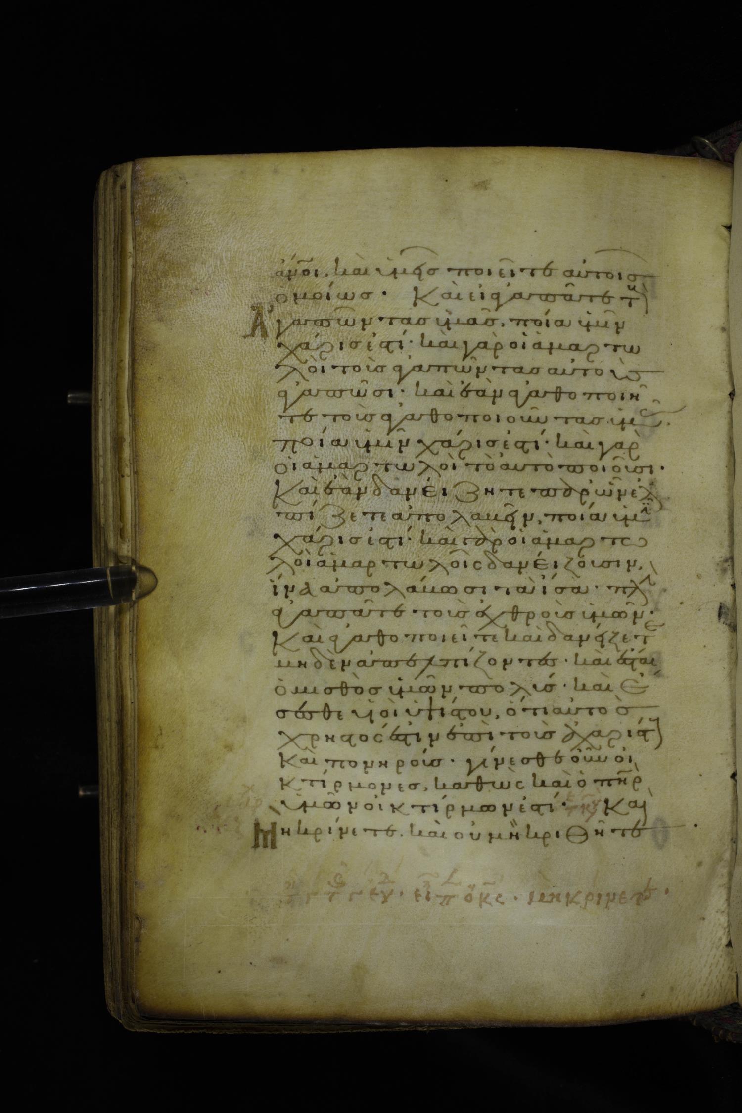 Twelfth century minuscule of the Gospel on parchment; 305 leaves, 1 column, 24 lines per column. Images were taken at the National Library of Greece in Athens.