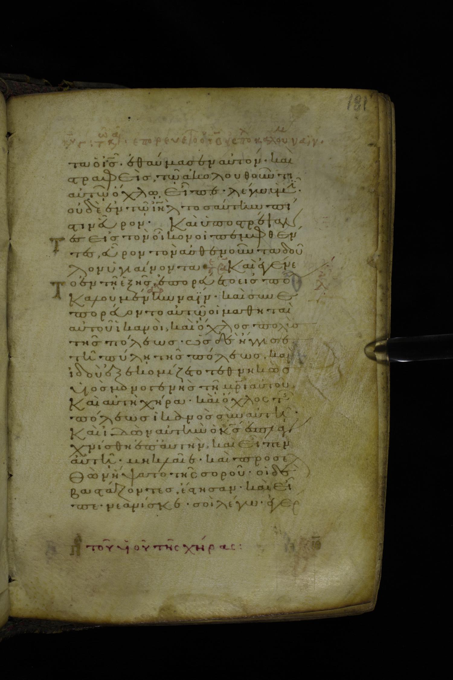 Twelfth century minuscule of the Gospel on parchment; 305 leaves, 1 column, 24 lines per column. Images were taken at the National Library of Greece in Athens.