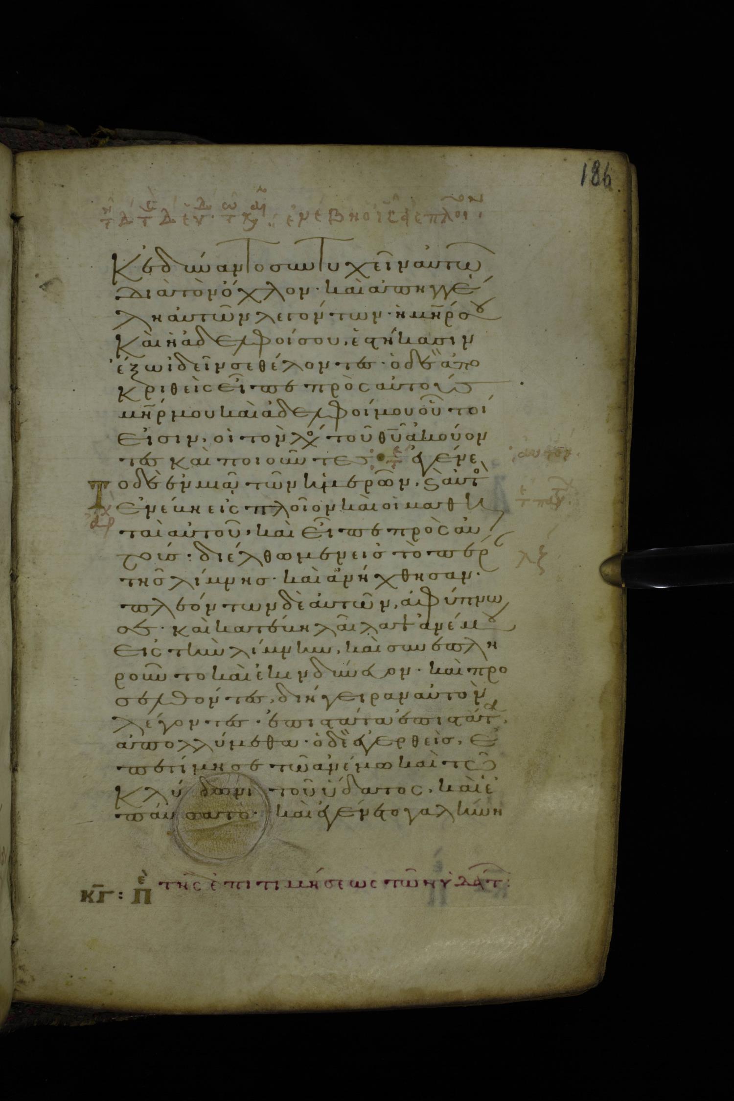 Twelfth century minuscule of the Gospel on parchment; 305 leaves, 1 column, 24 lines per column. Images were taken at the National Library of Greece in Athens.