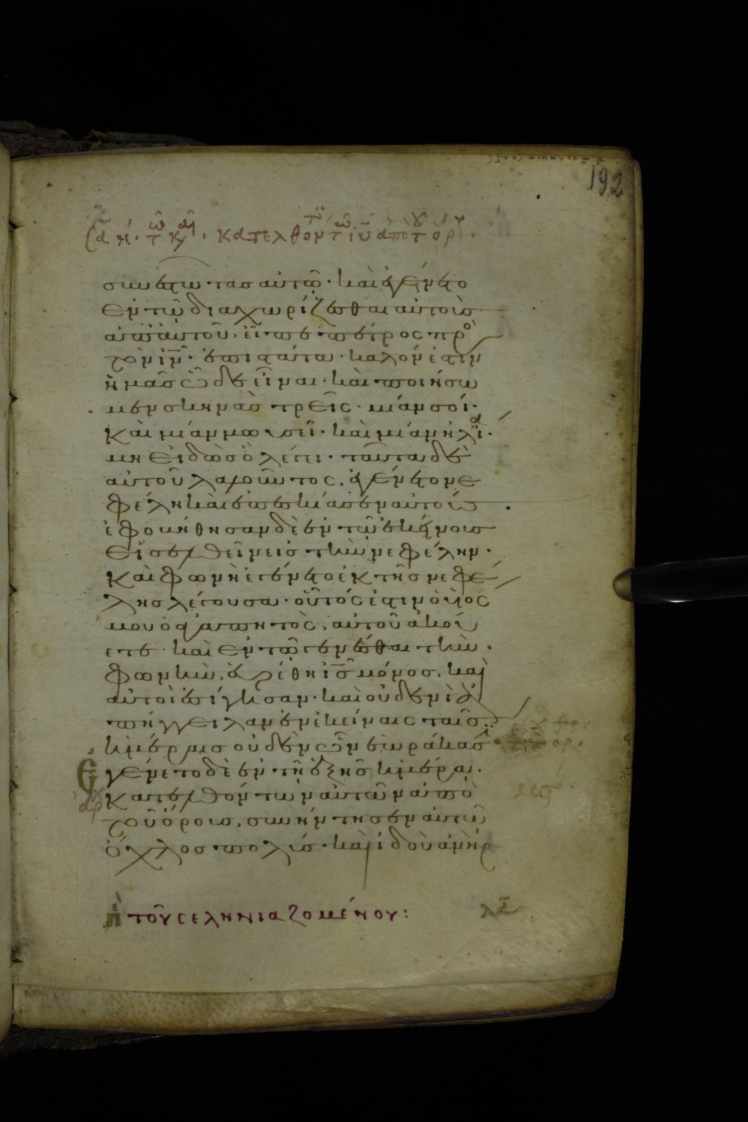 Twelfth century minuscule of the Gospel on parchment; 305 leaves, 1 column, 24 lines per column. Images were taken at the National Library of Greece in Athens.