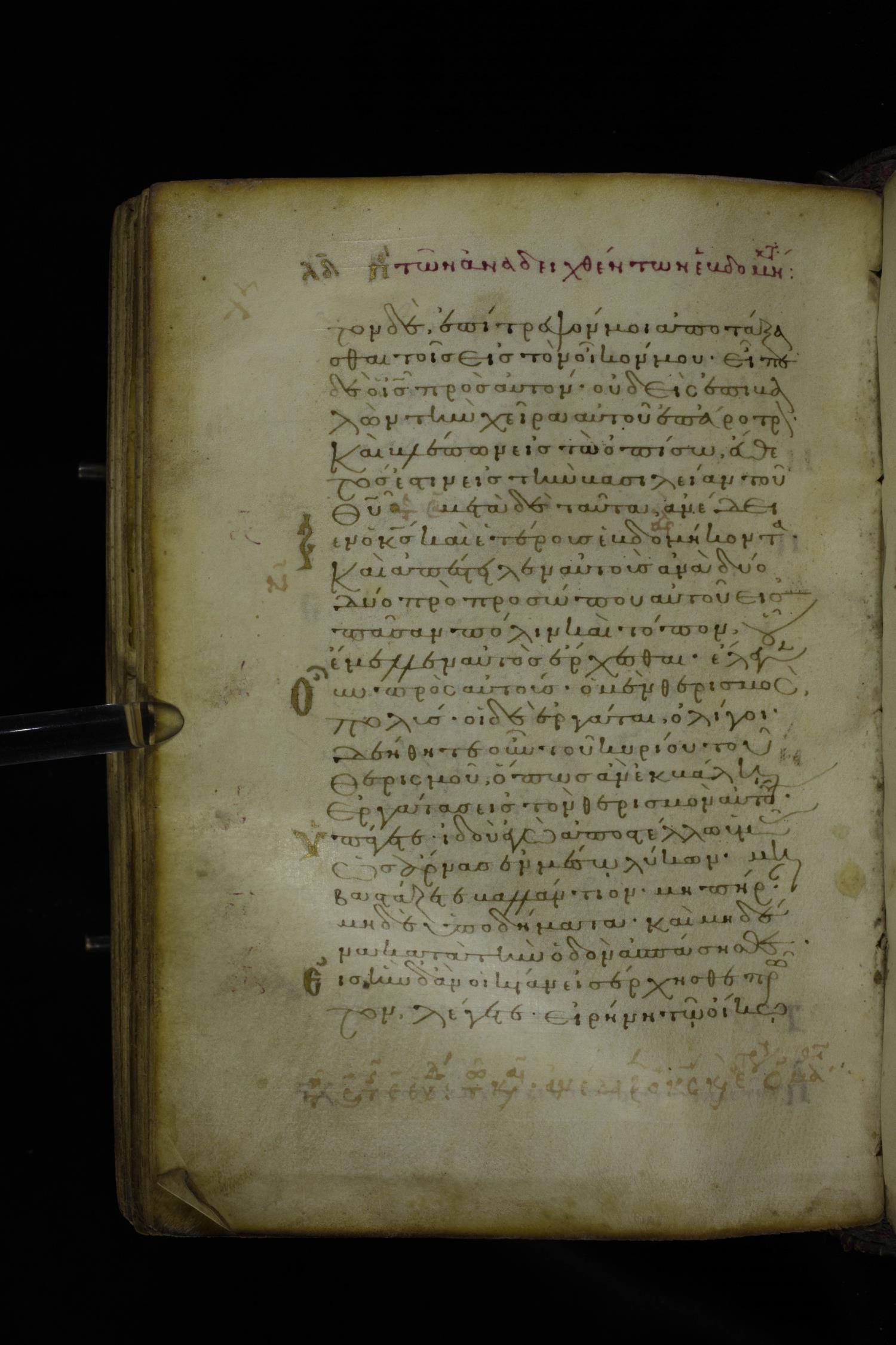 Twelfth century minuscule of the Gospel on parchment; 305 leaves, 1 column, 24 lines per column. Images were taken at the National Library of Greece in Athens.