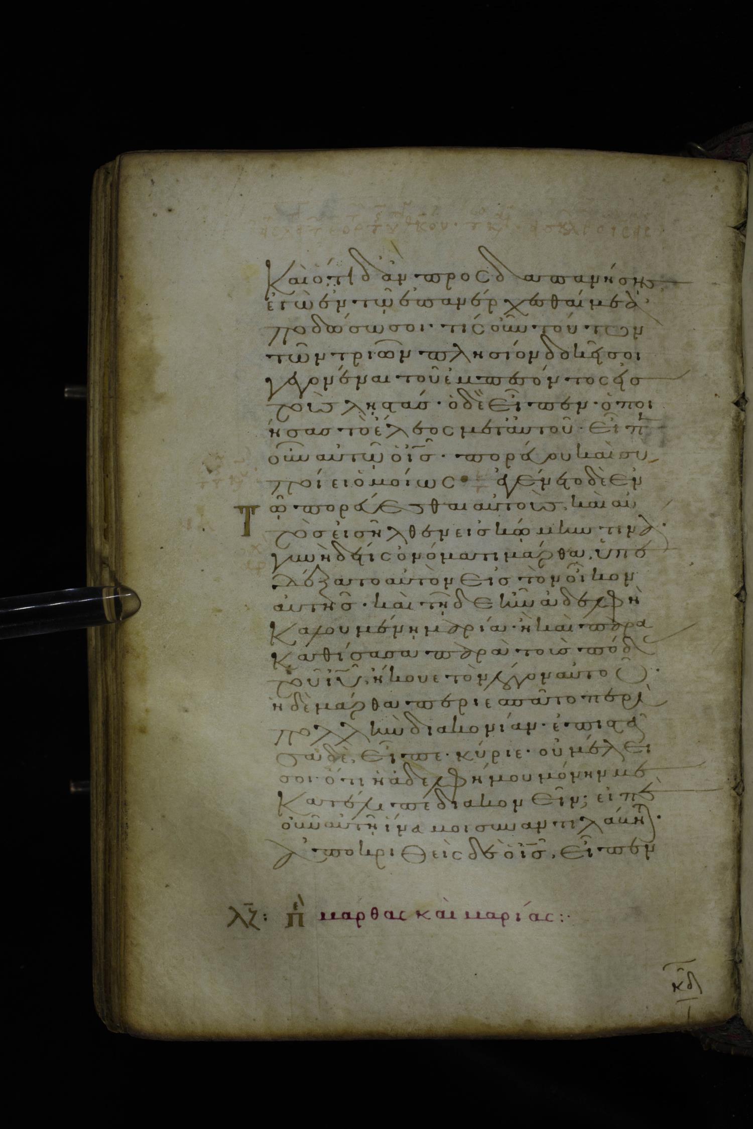 Twelfth century minuscule of the Gospel on parchment; 305 leaves, 1 column, 24 lines per column. Images were taken at the National Library of Greece in Athens.
