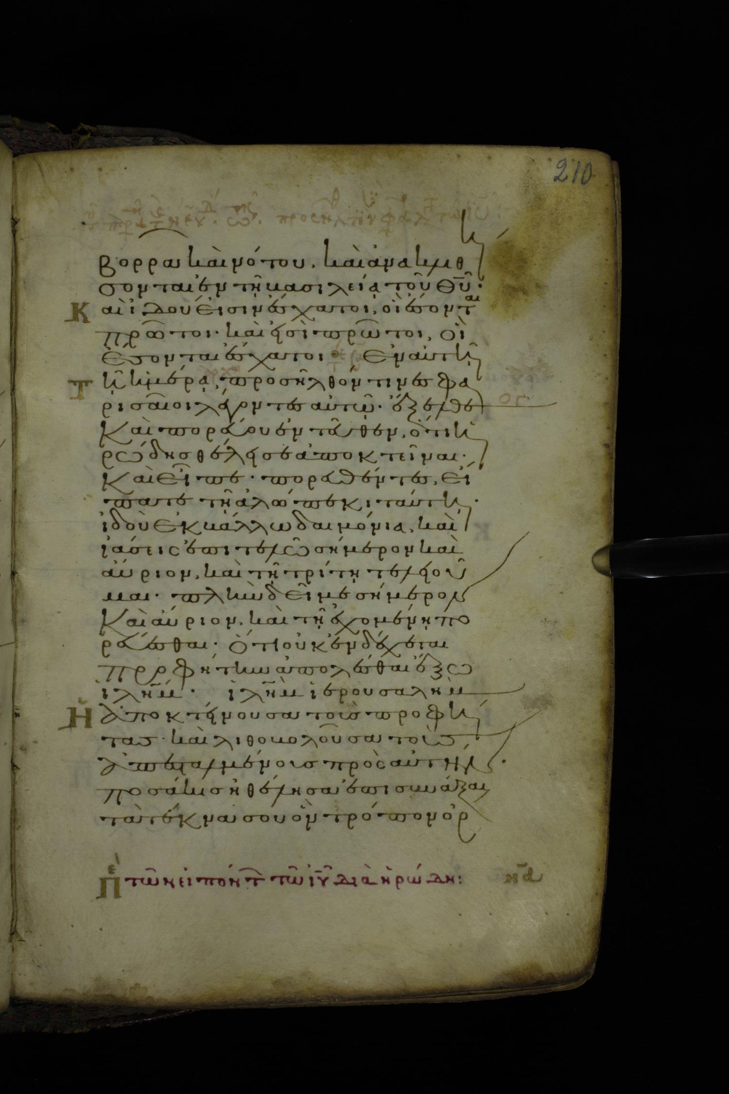 Twelfth century minuscule of the Gospel on parchment; 305 leaves, 1 column, 24 lines per column. Images were taken at the National Library of Greece in Athens.