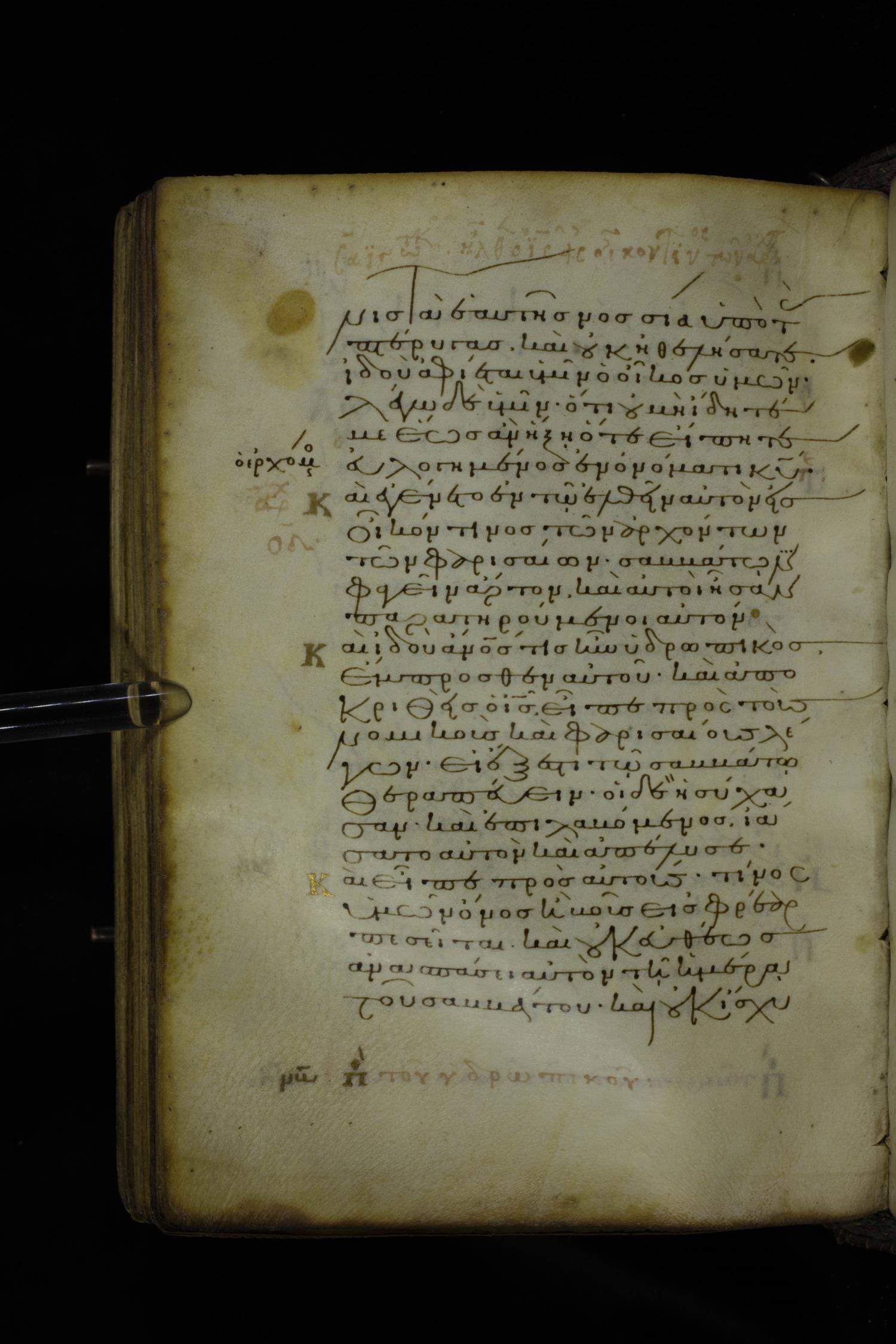 Twelfth century minuscule of the Gospel on parchment; 305 leaves, 1 column, 24 lines per column. Images were taken at the National Library of Greece in Athens.