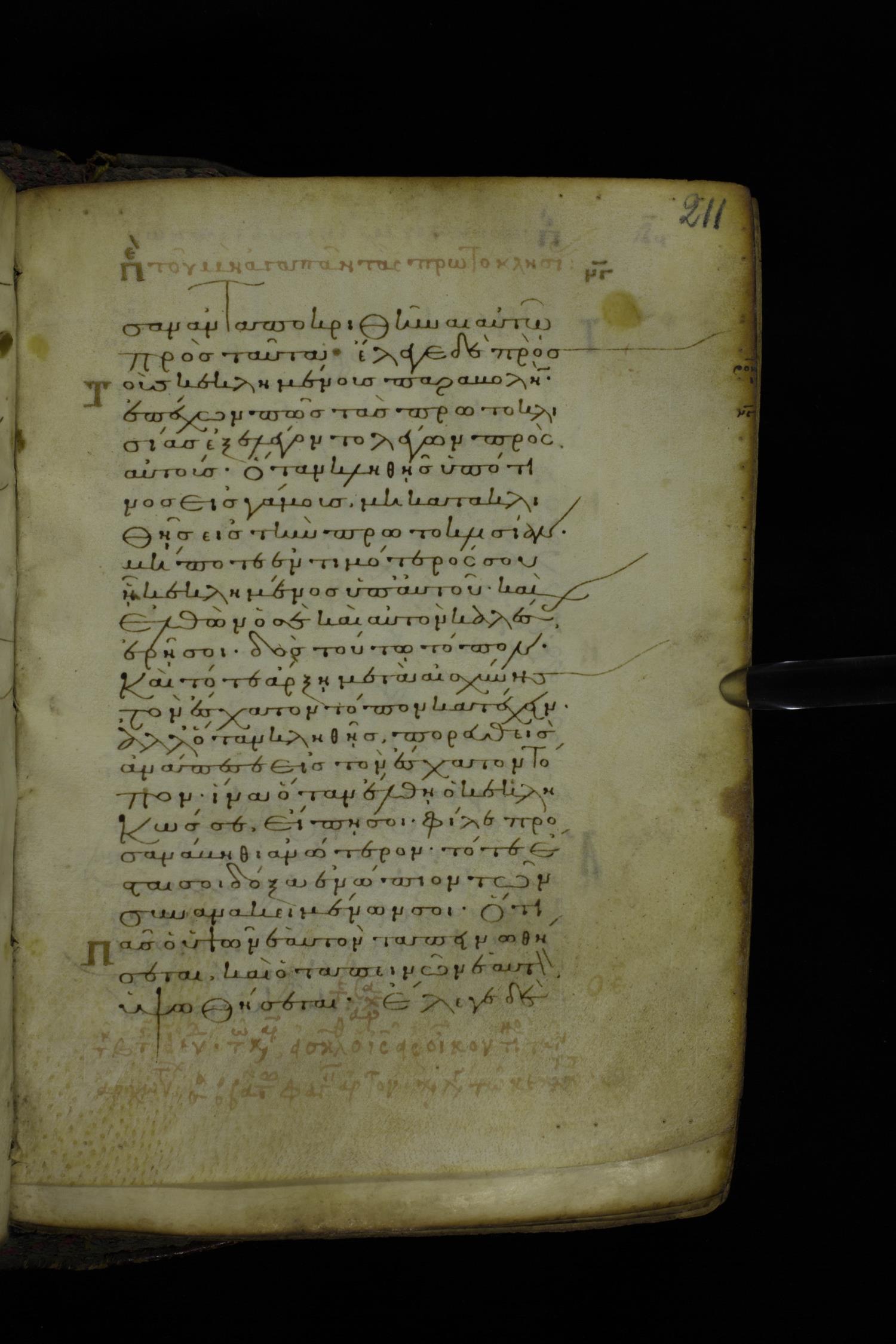 Twelfth century minuscule of the Gospel on parchment; 305 leaves, 1 column, 24 lines per column. Images were taken at the National Library of Greece in Athens.