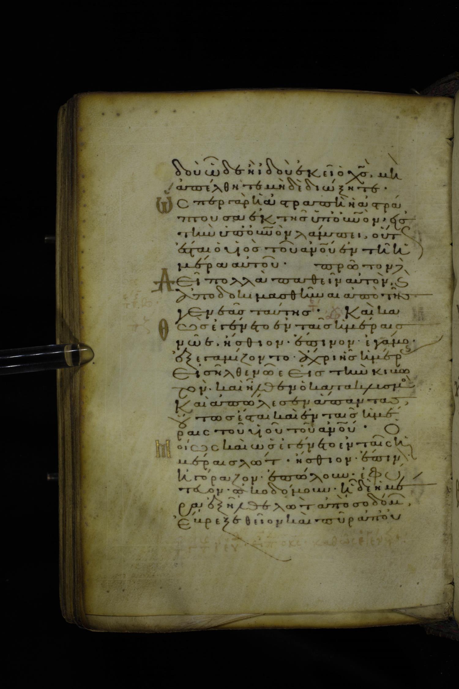 Twelfth century minuscule of the Gospel on parchment; 305 leaves, 1 column, 24 lines per column. Images were taken at the National Library of Greece in Athens.