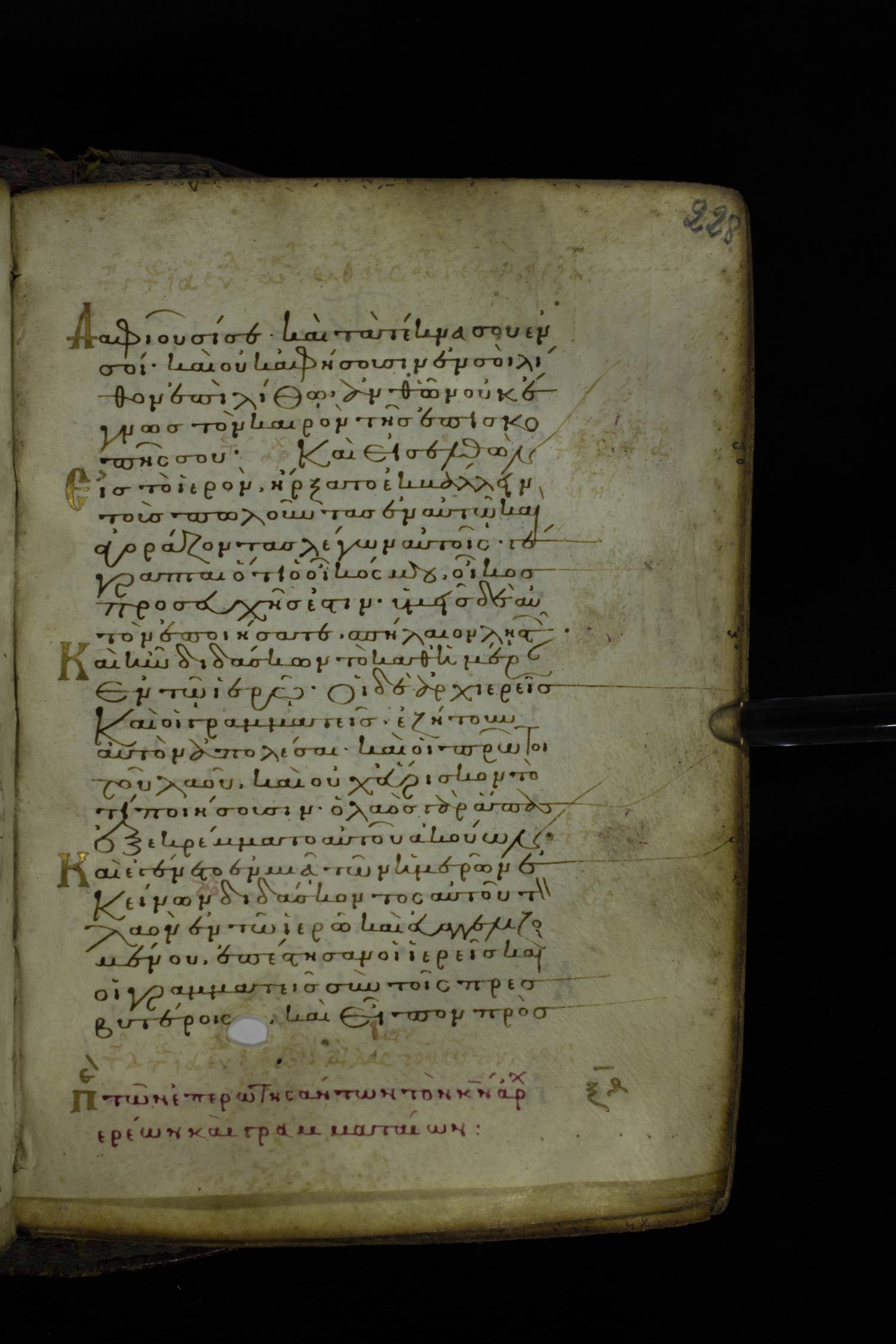 Twelfth century minuscule of the Gospel on parchment; 305 leaves, 1 column, 24 lines per column. Images were taken at the National Library of Greece in Athens.