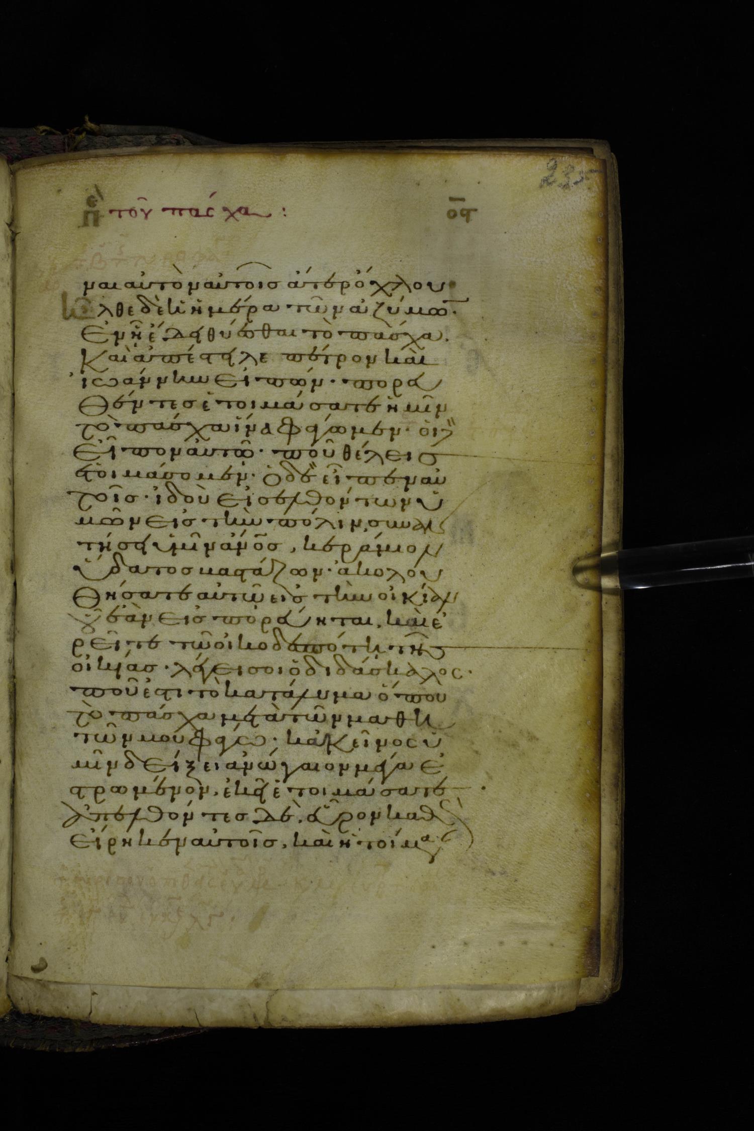 Twelfth century minuscule of the Gospel on parchment; 305 leaves, 1 column, 24 lines per column. Images were taken at the National Library of Greece in Athens.