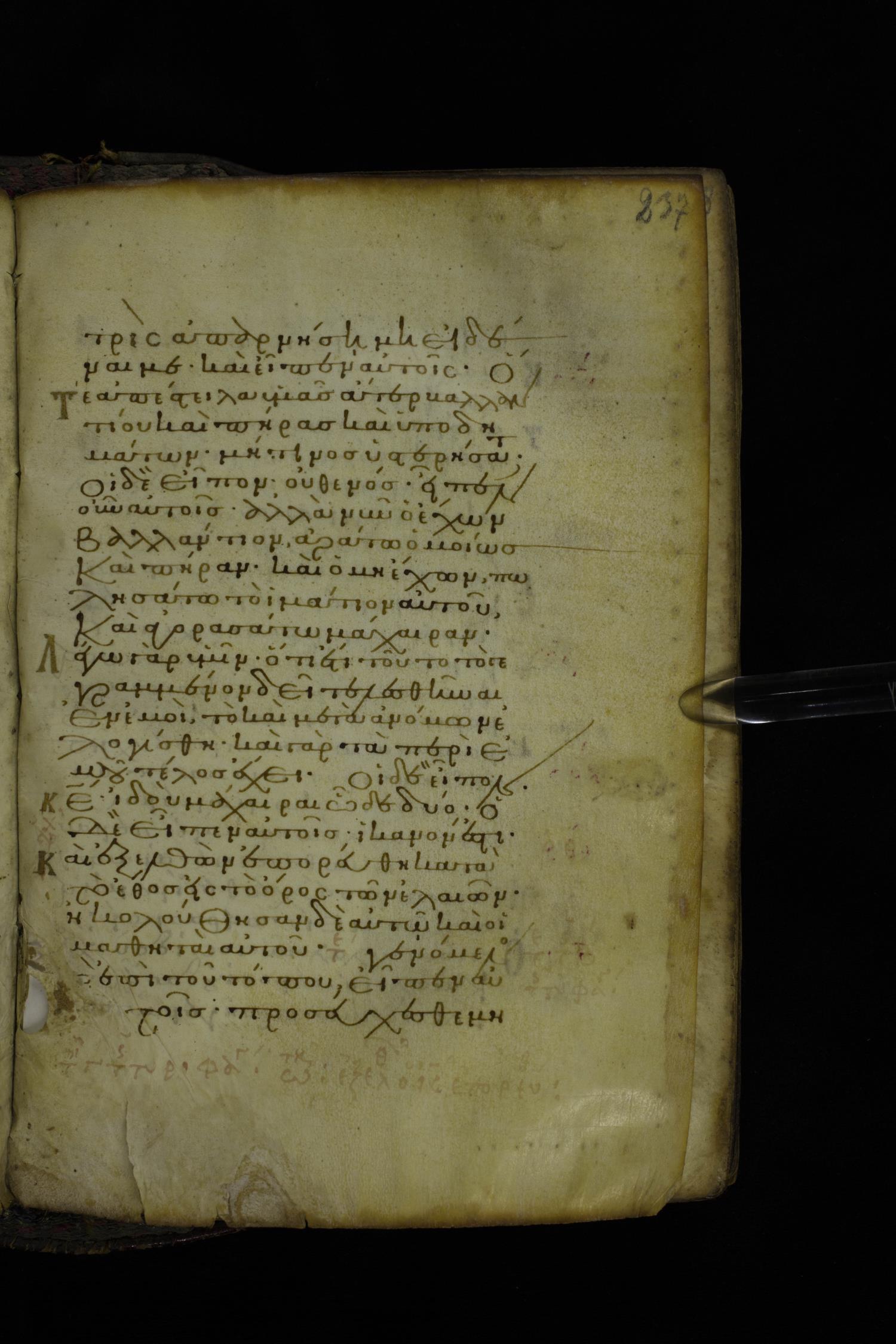 Twelfth century minuscule of the Gospel on parchment; 305 leaves, 1 column, 24 lines per column. Images were taken at the National Library of Greece in Athens.