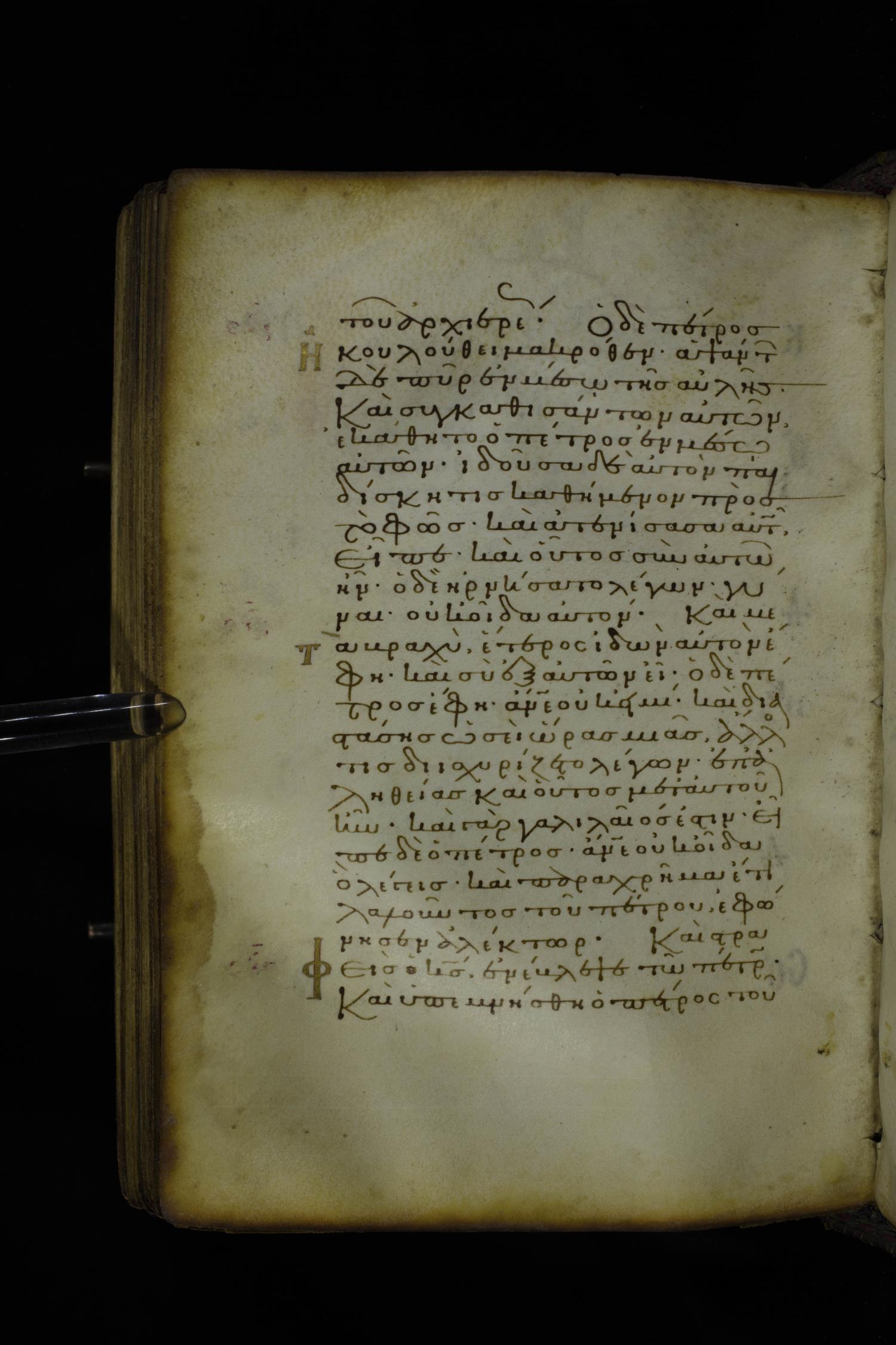 Twelfth century minuscule of the Gospel on parchment; 305 leaves, 1 column, 24 lines per column. Images were taken at the National Library of Greece in Athens.