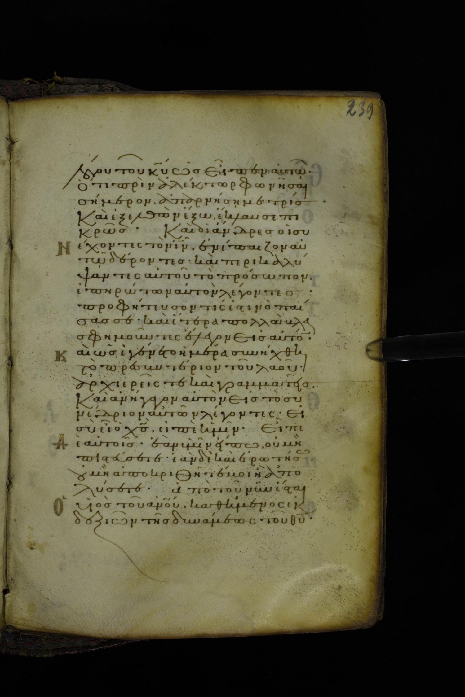 Twelfth century minuscule of the Gospel on parchment; 305 leaves, 1 column, 24 lines per column. Images were taken at the National Library of Greece in Athens.