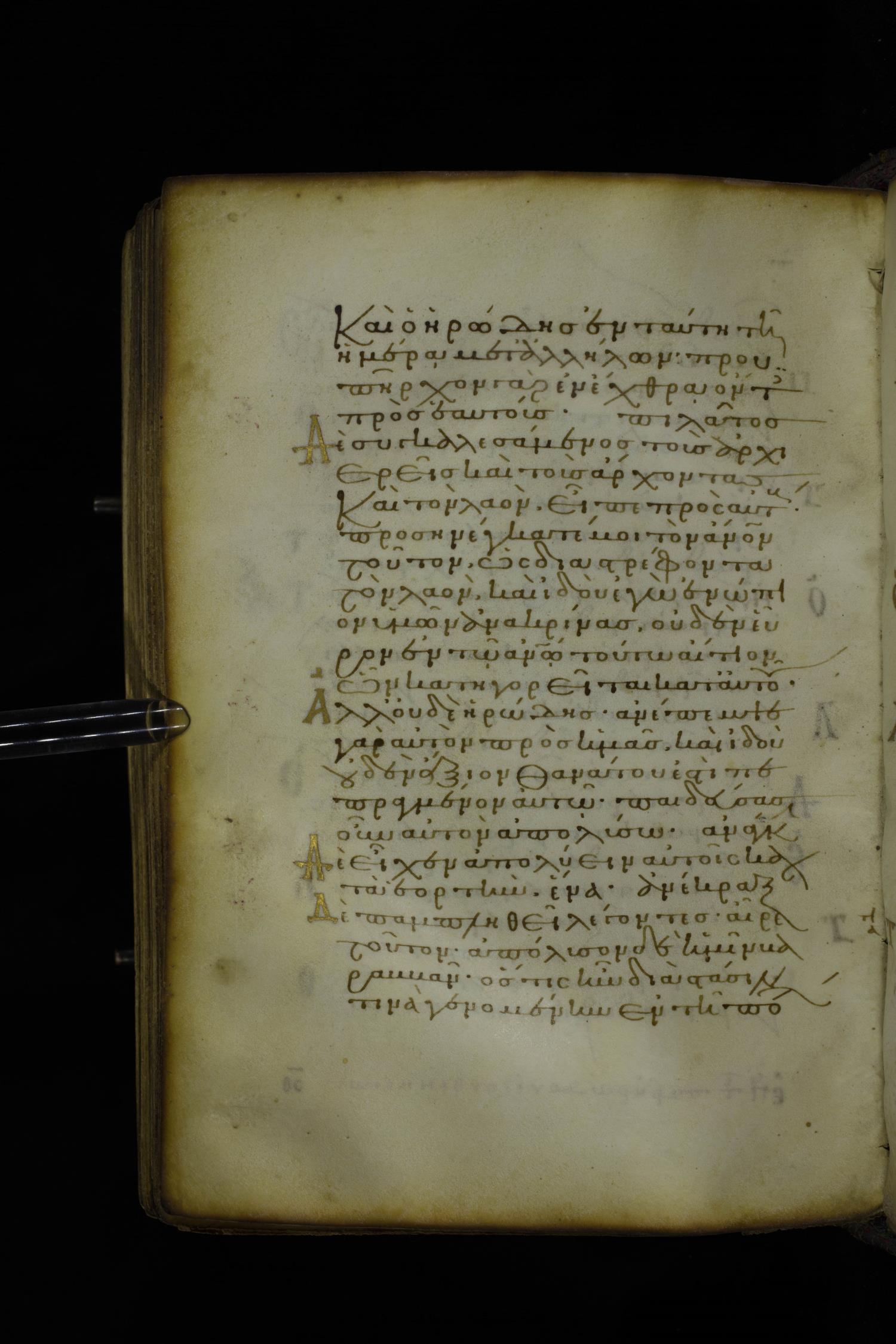 Twelfth century minuscule of the Gospel on parchment; 305 leaves, 1 column, 24 lines per column. Images were taken at the National Library of Greece in Athens.