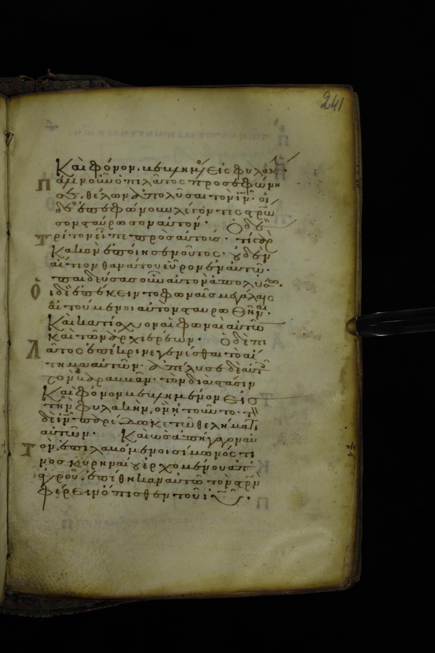 Twelfth century minuscule of the Gospel on parchment; 305 leaves, 1 column, 24 lines per column. Images were taken at the National Library of Greece in Athens.