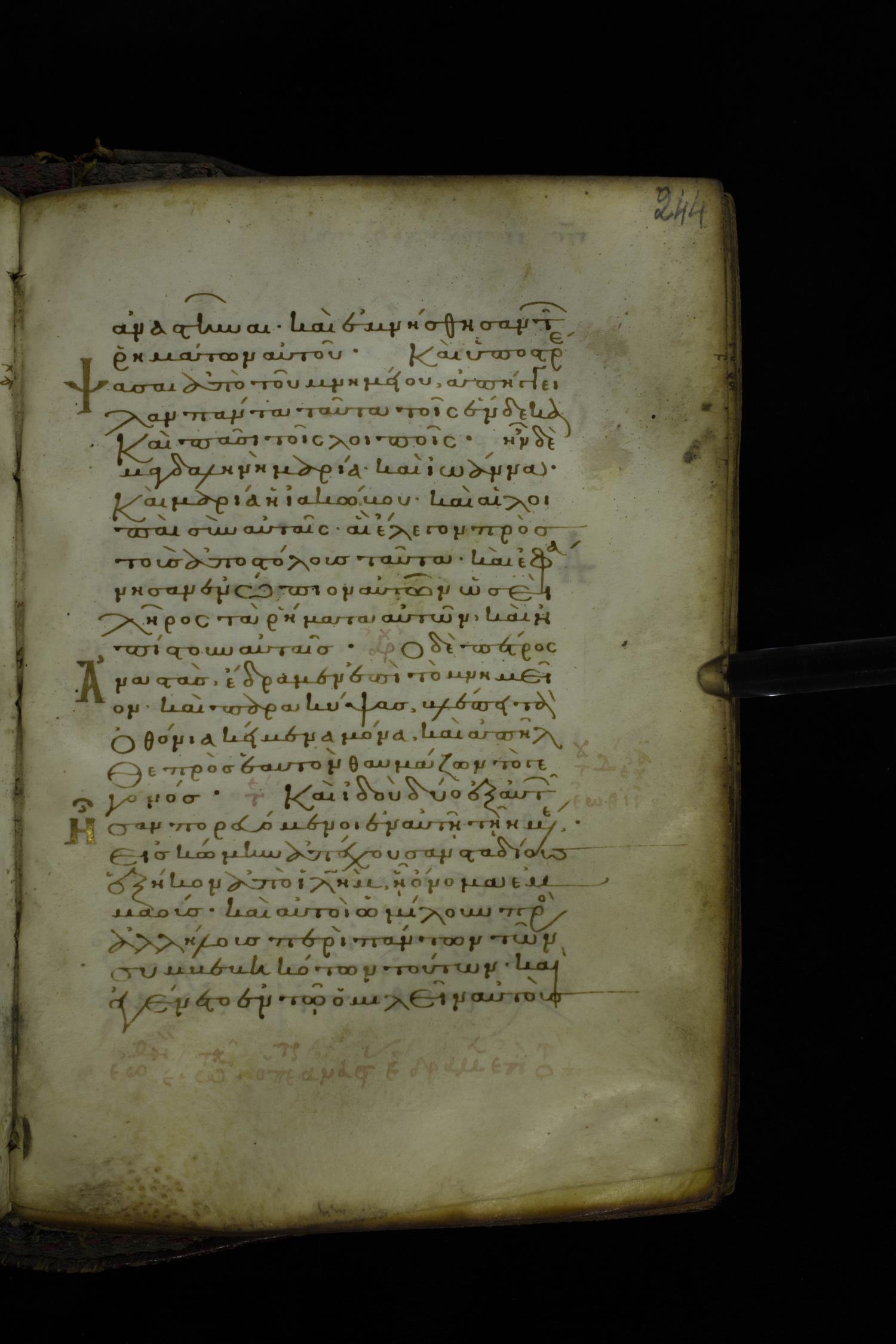 Twelfth century minuscule of the Gospel on parchment; 305 leaves, 1 column, 24 lines per column. Images were taken at the National Library of Greece in Athens.