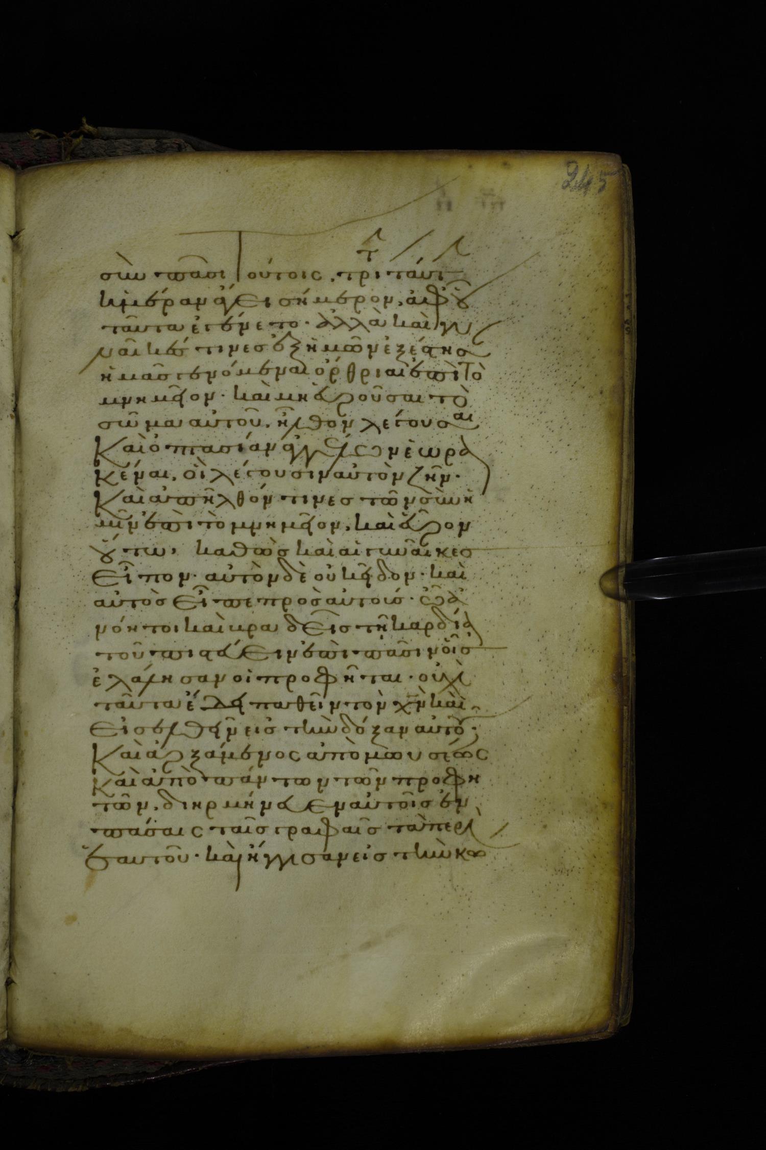 Twelfth century minuscule of the Gospel on parchment; 305 leaves, 1 column, 24 lines per column. Images were taken at the National Library of Greece in Athens.