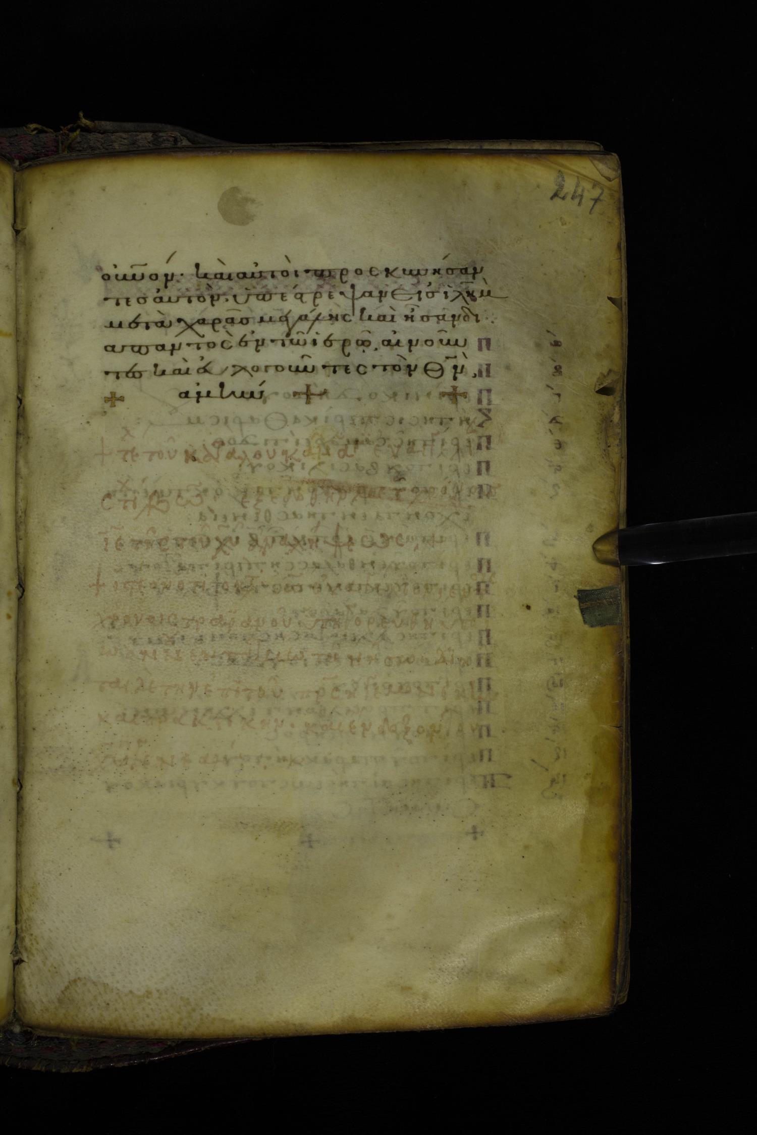 Twelfth century minuscule of the Gospel on parchment; 305 leaves, 1 column, 24 lines per column. Images were taken at the National Library of Greece in Athens.