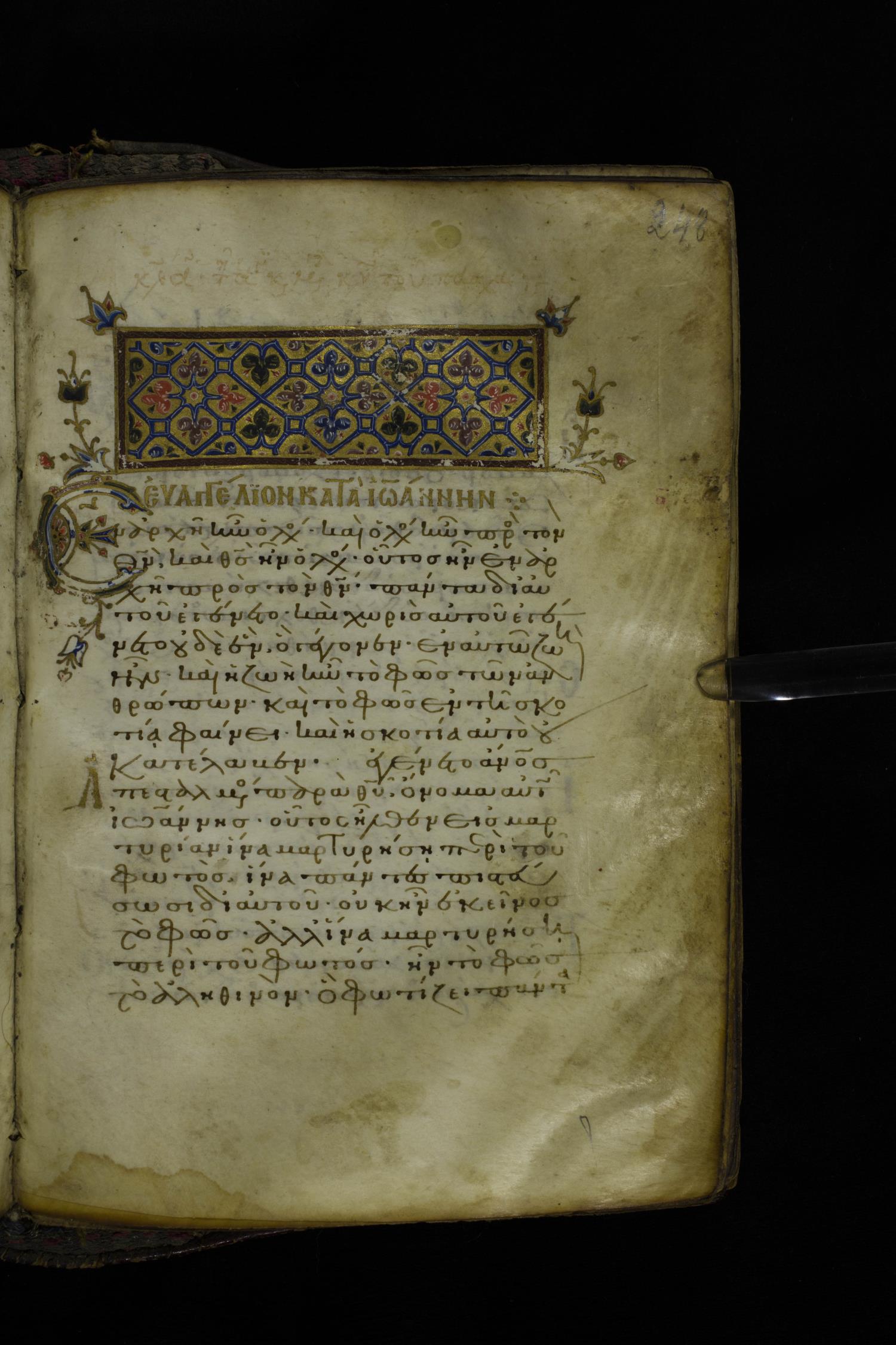 Twelfth century minuscule of the Gospel on parchment; 305 leaves, 1 column, 24 lines per column. Images were taken at the National Library of Greece in Athens.