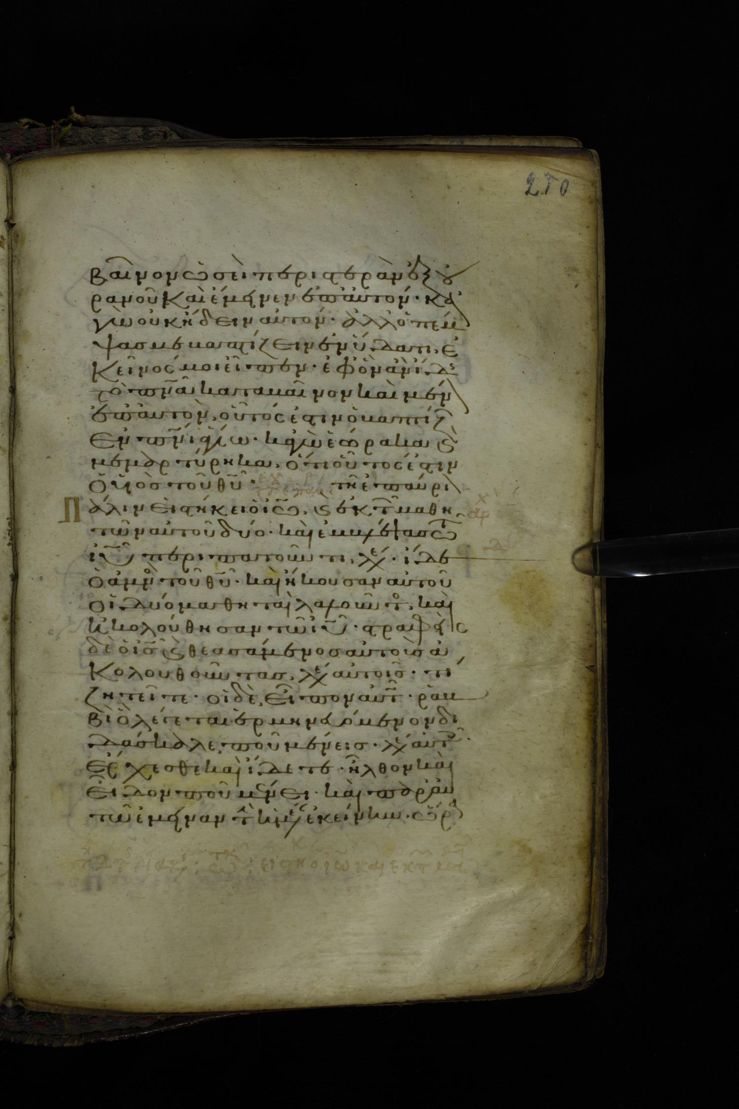 Twelfth century minuscule of the Gospel on parchment; 305 leaves, 1 column, 24 lines per column. Images were taken at the National Library of Greece in Athens.