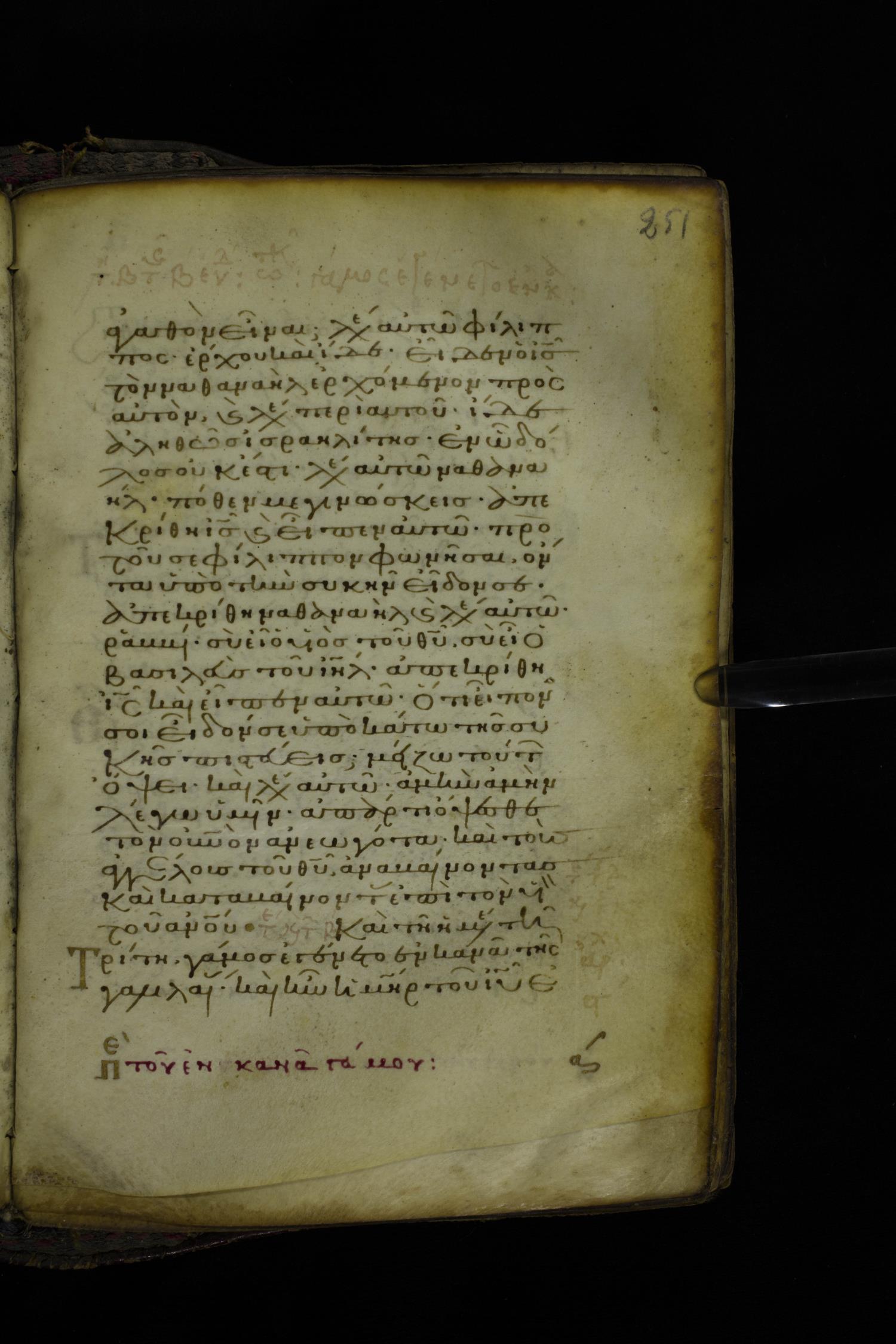 Twelfth century minuscule of the Gospel on parchment; 305 leaves, 1 column, 24 lines per column. Images were taken at the National Library of Greece in Athens.