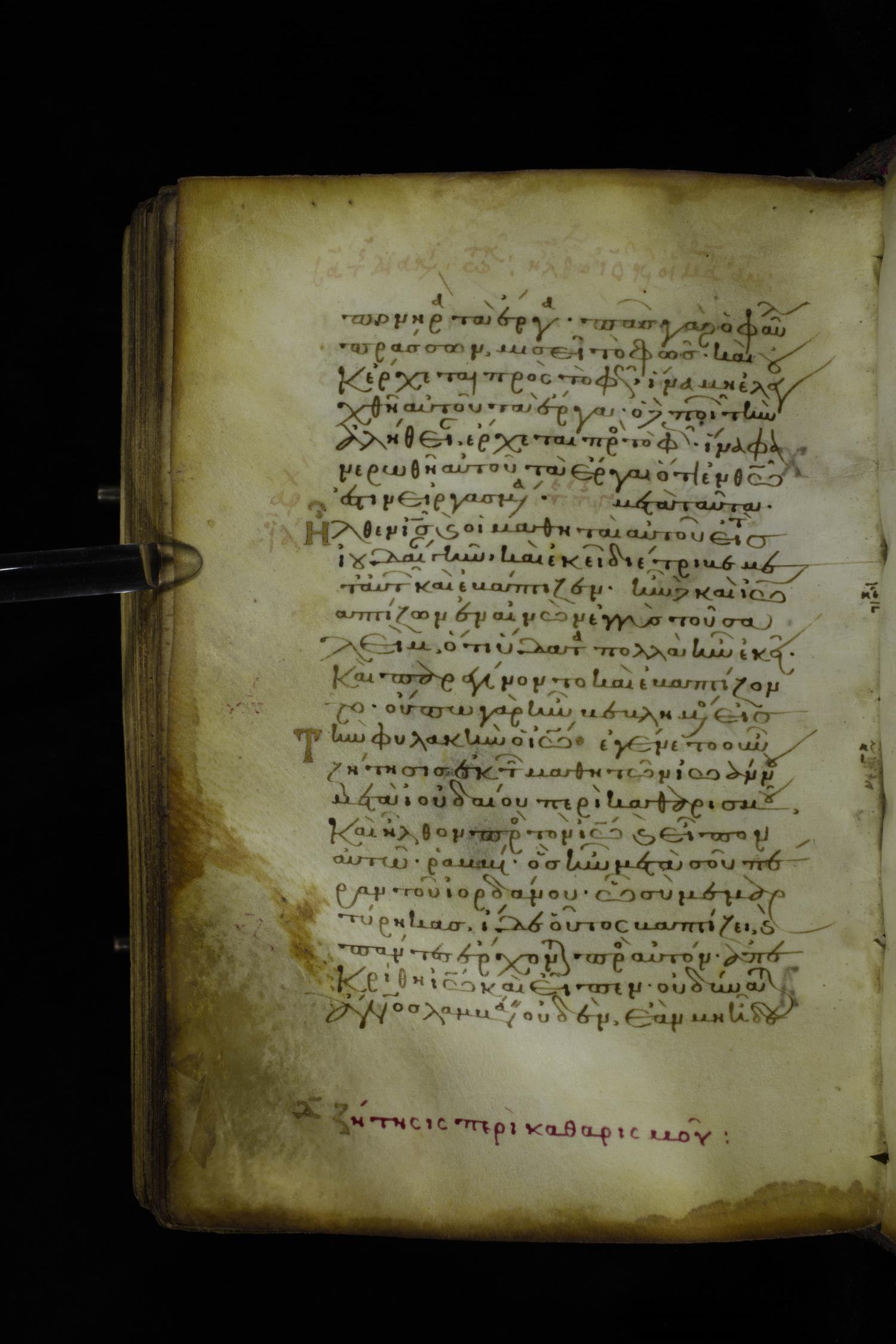 Twelfth century minuscule of the Gospel on parchment; 305 leaves, 1 column, 24 lines per column. Images were taken at the National Library of Greece in Athens.