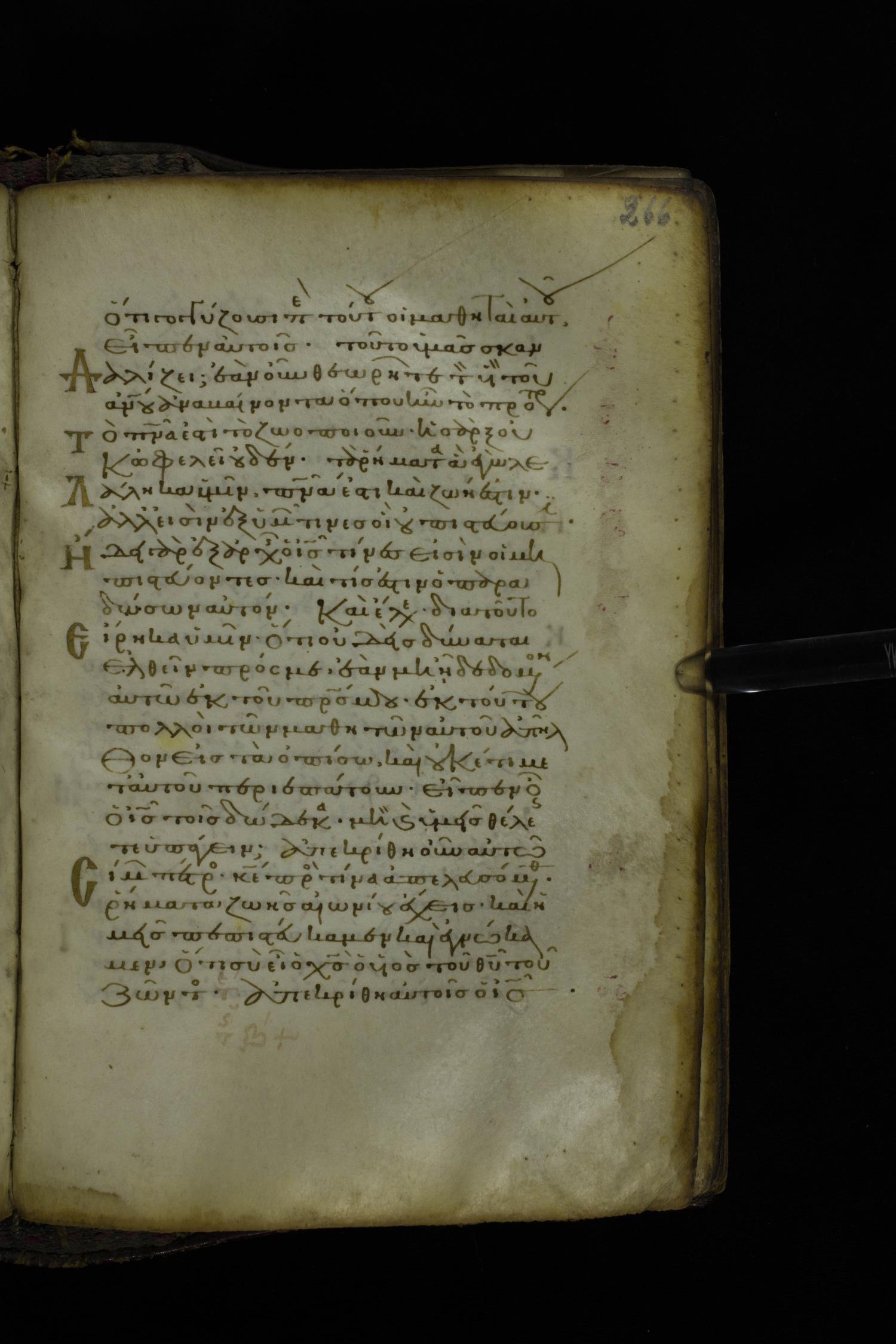 Twelfth century minuscule of the Gospel on parchment; 305 leaves, 1 column, 24 lines per column. Images were taken at the National Library of Greece in Athens.