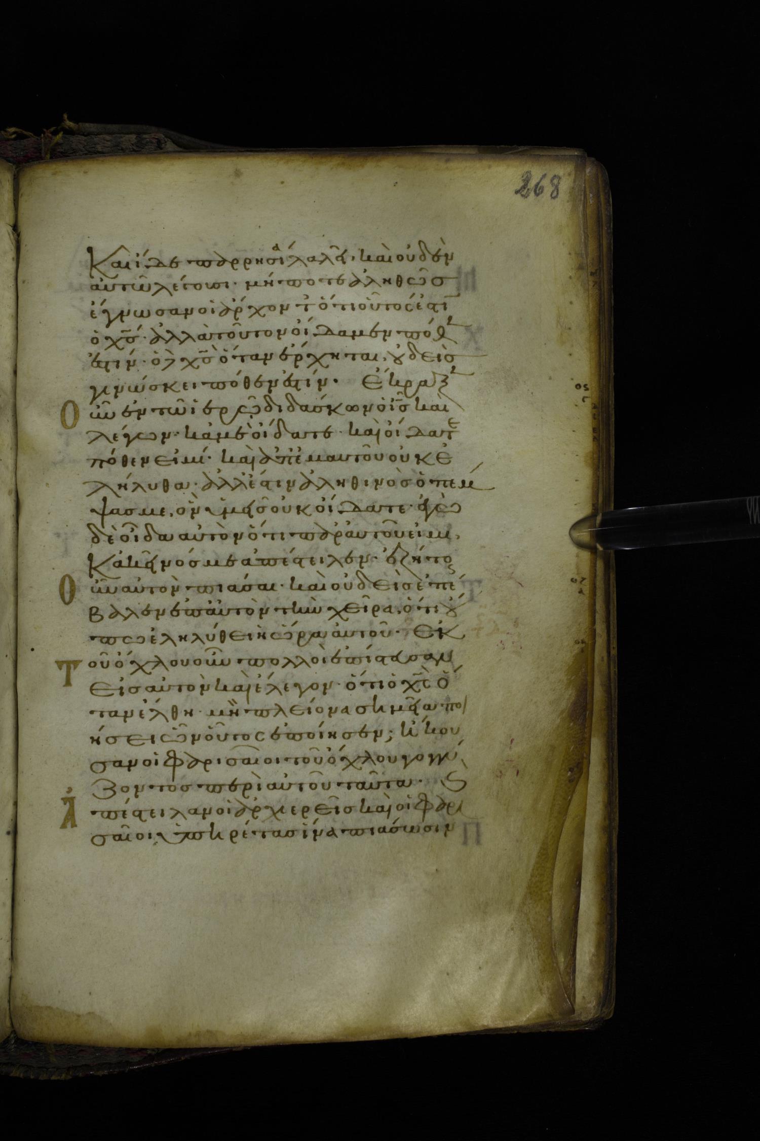 Twelfth century minuscule of the Gospel on parchment; 305 leaves, 1 column, 24 lines per column. Images were taken at the National Library of Greece in Athens.