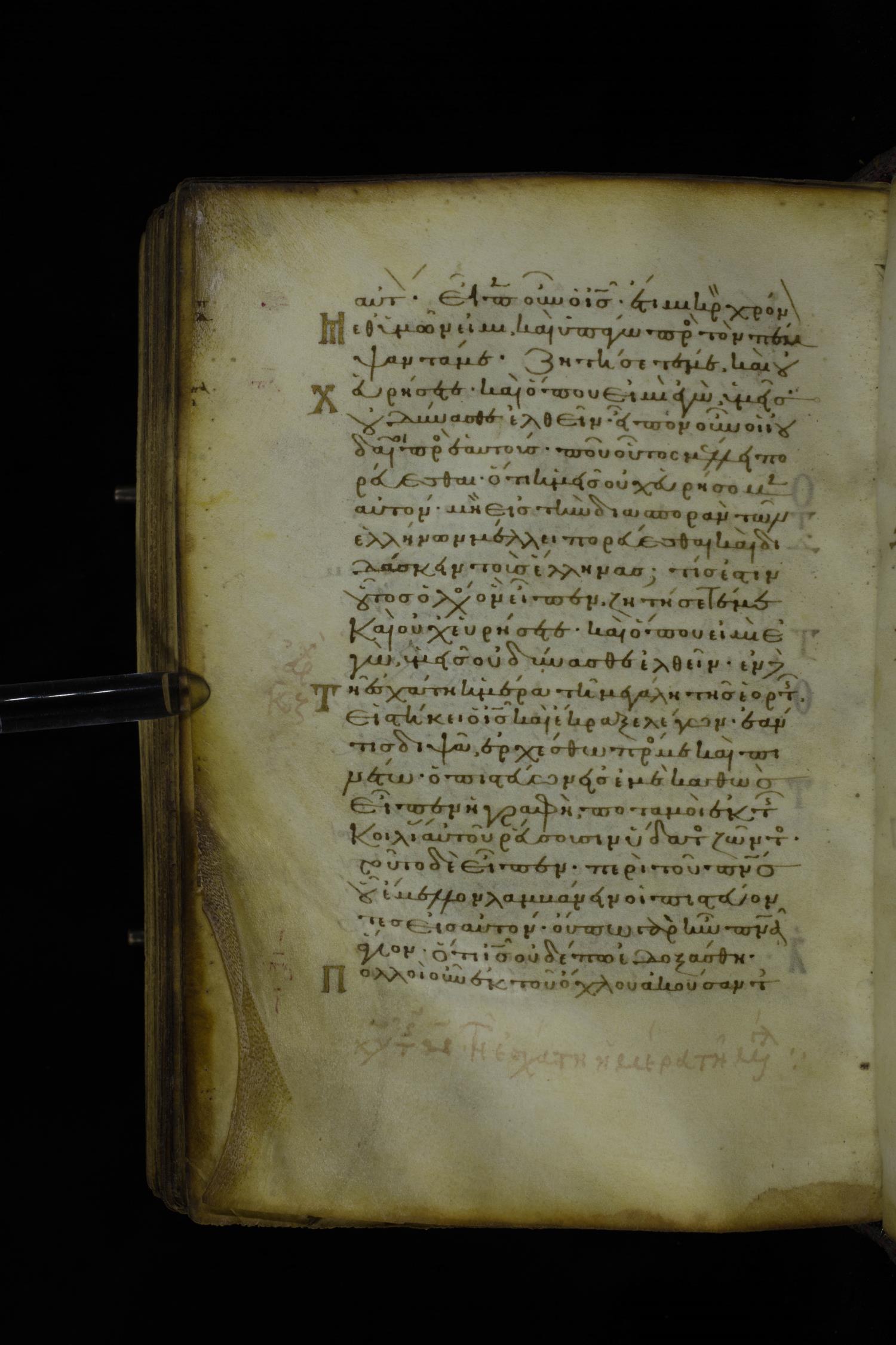 Twelfth century minuscule of the Gospel on parchment; 305 leaves, 1 column, 24 lines per column. Images were taken at the National Library of Greece in Athens.
