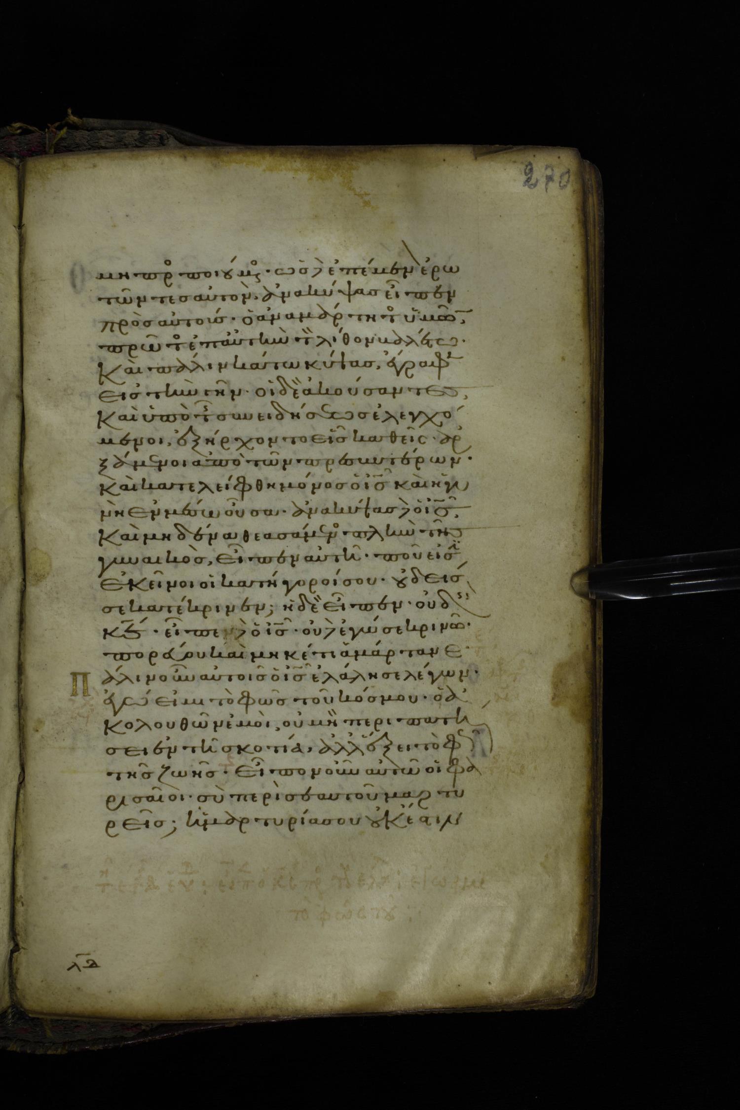 Twelfth century minuscule of the Gospel on parchment; 305 leaves, 1 column, 24 lines per column. Images were taken at the National Library of Greece in Athens.