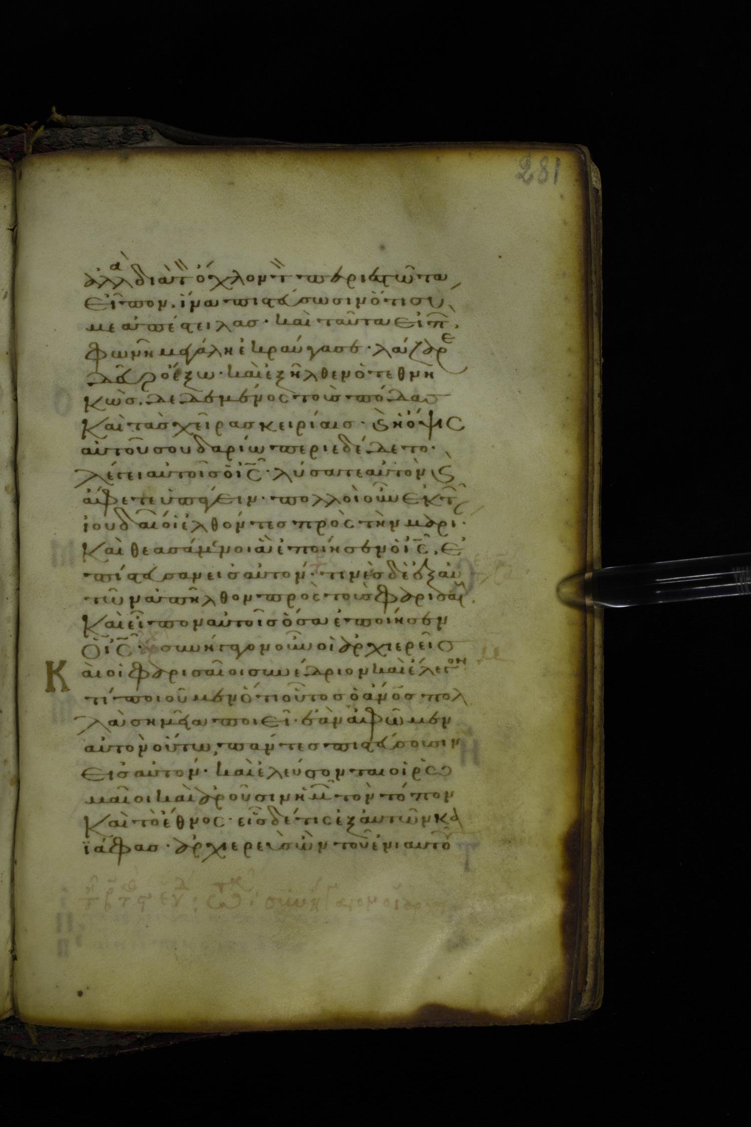 Twelfth century minuscule of the Gospel on parchment; 305 leaves, 1 column, 24 lines per column. Images were taken at the National Library of Greece in Athens.