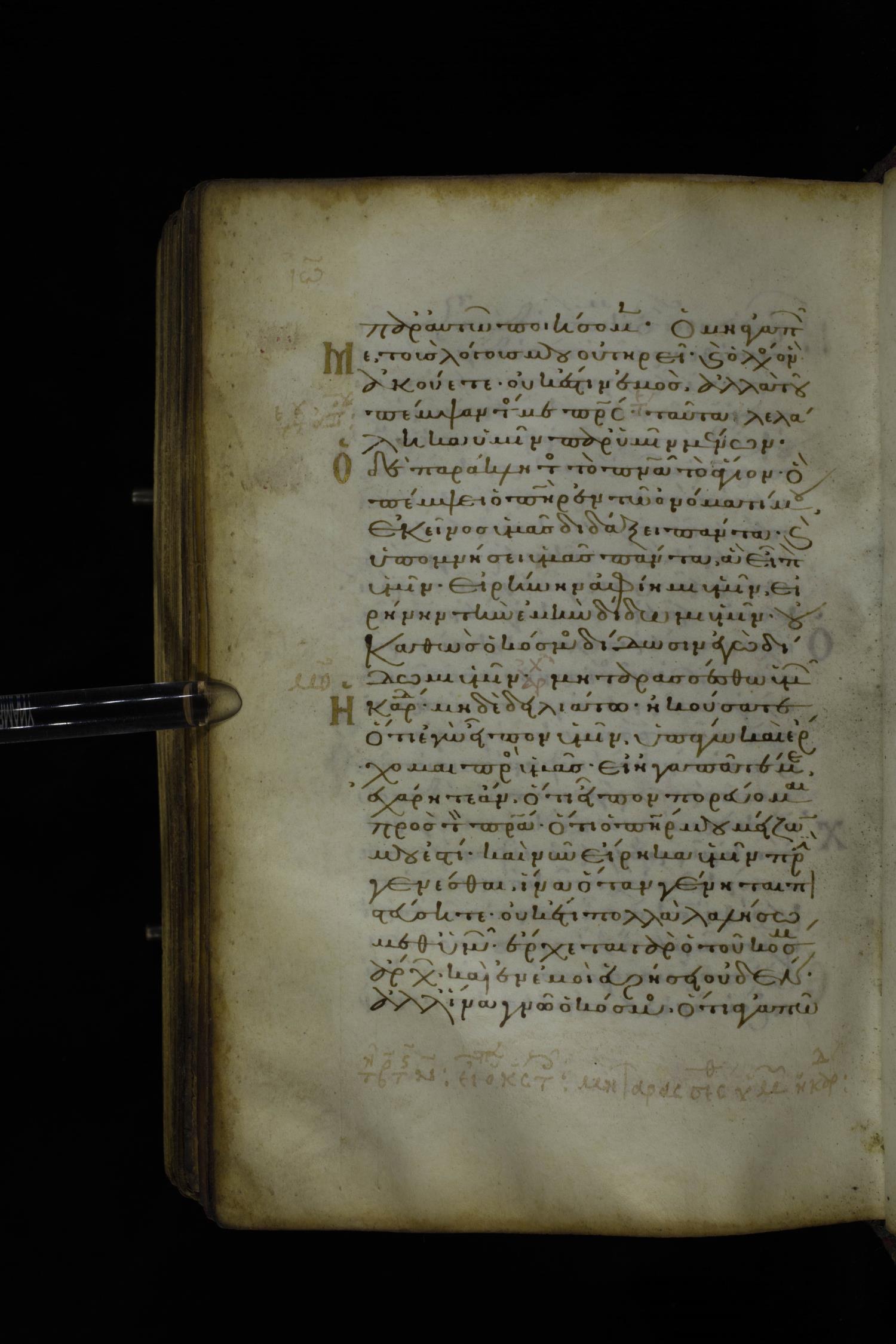 Twelfth century minuscule of the Gospel on parchment; 305 leaves, 1 column, 24 lines per column. Images were taken at the National Library of Greece in Athens.