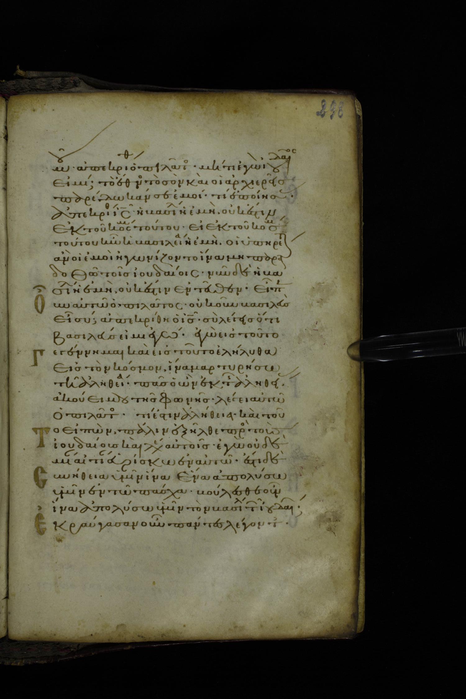 Twelfth century minuscule of the Gospel on parchment; 305 leaves, 1 column, 24 lines per column. Images were taken at the National Library of Greece in Athens.