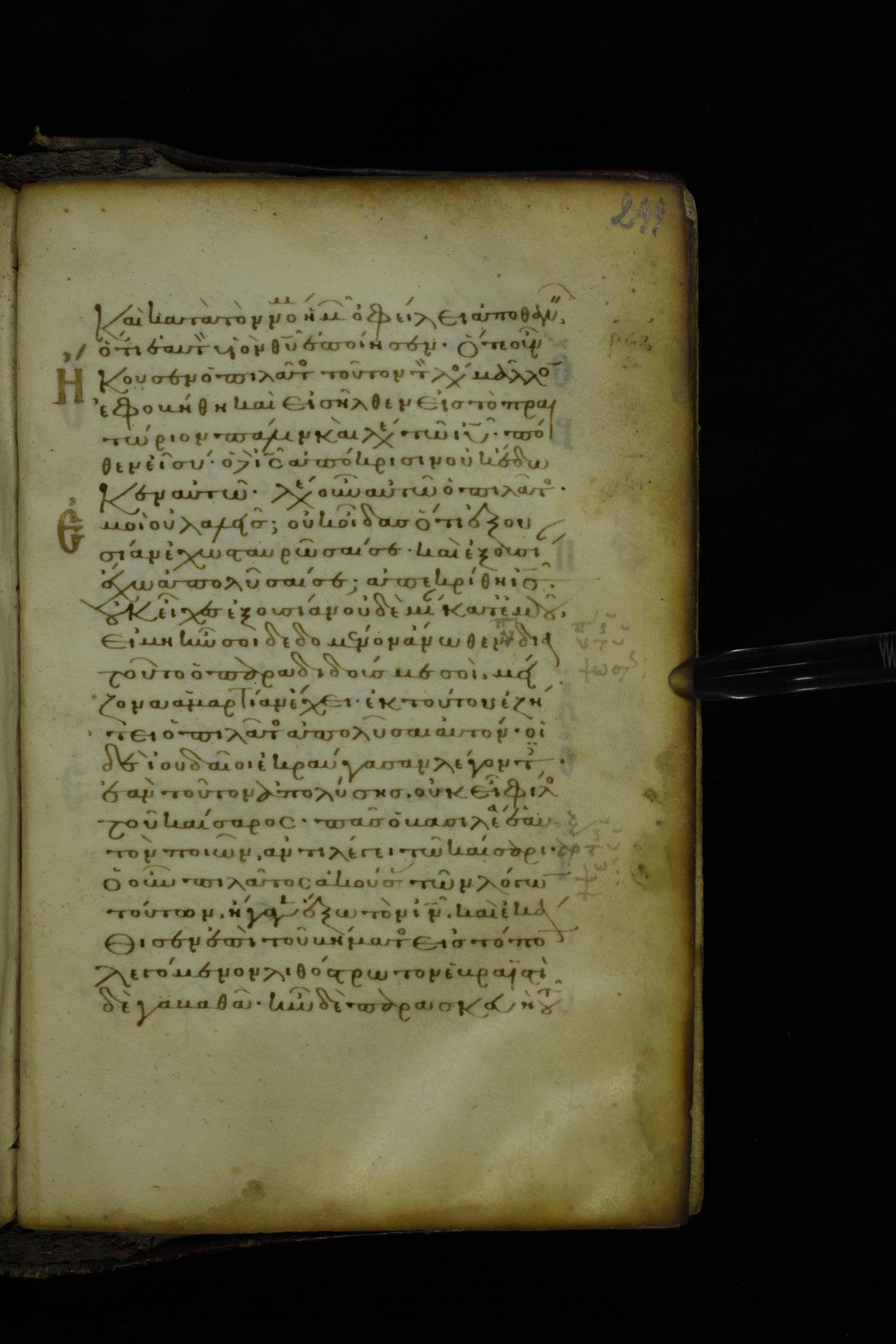 Twelfth century minuscule of the Gospel on parchment; 305 leaves, 1 column, 24 lines per column. Images were taken at the National Library of Greece in Athens.