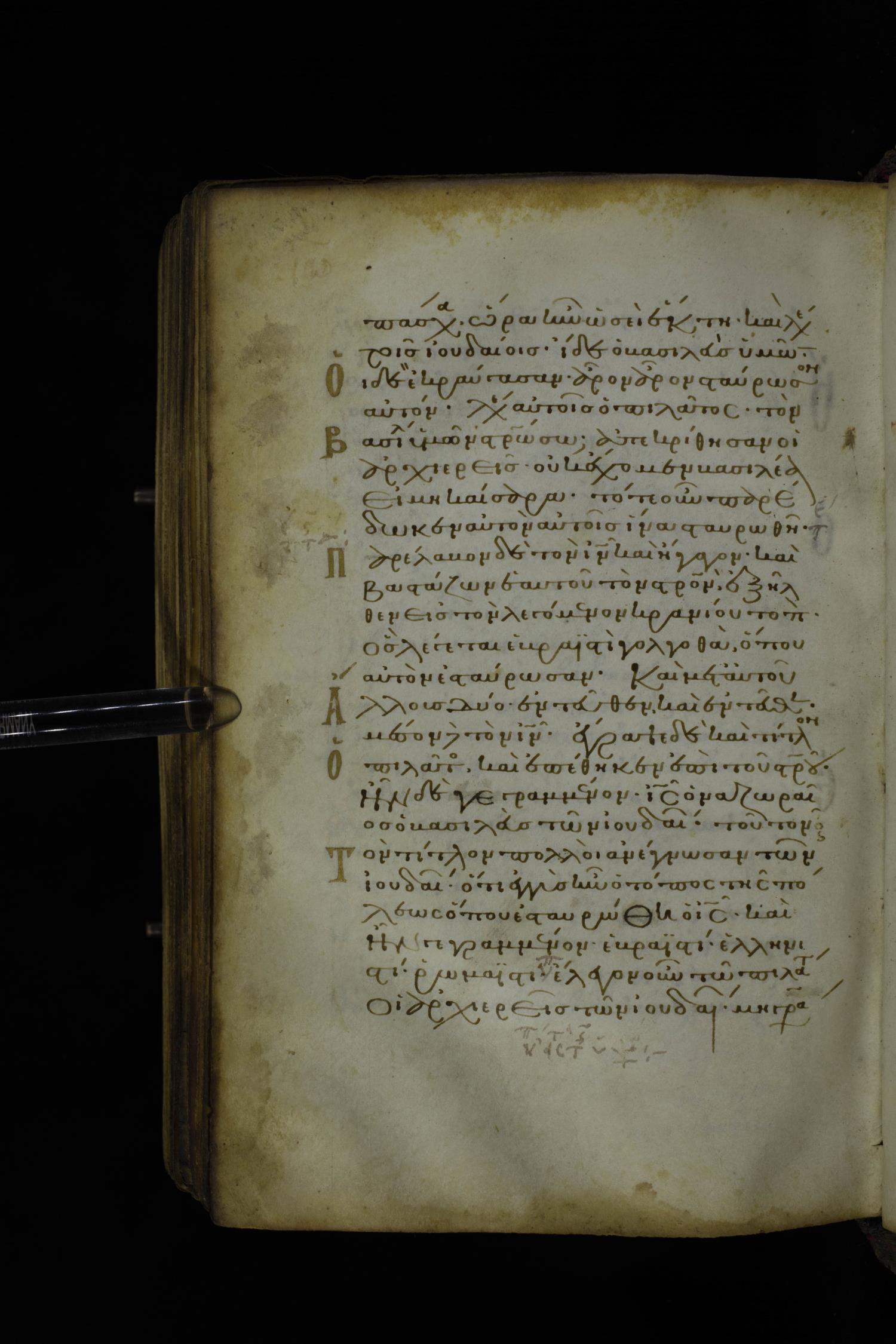 Twelfth century minuscule of the Gospel on parchment; 305 leaves, 1 column, 24 lines per column. Images were taken at the National Library of Greece in Athens.