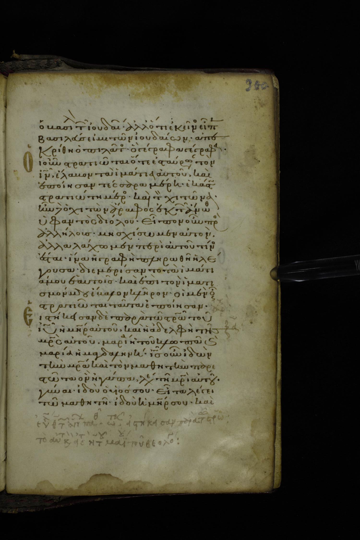 Twelfth century minuscule of the Gospel on parchment; 305 leaves, 1 column, 24 lines per column. Images were taken at the National Library of Greece in Athens.