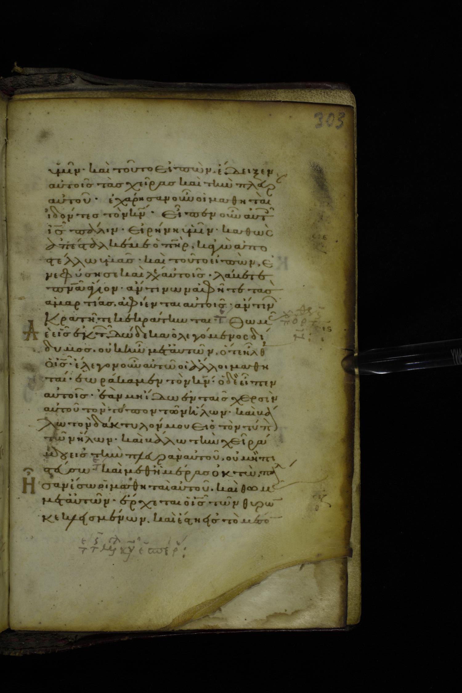 Twelfth century minuscule of the Gospel on parchment; 305 leaves, 1 column, 24 lines per column. Images were taken at the National Library of Greece in Athens.