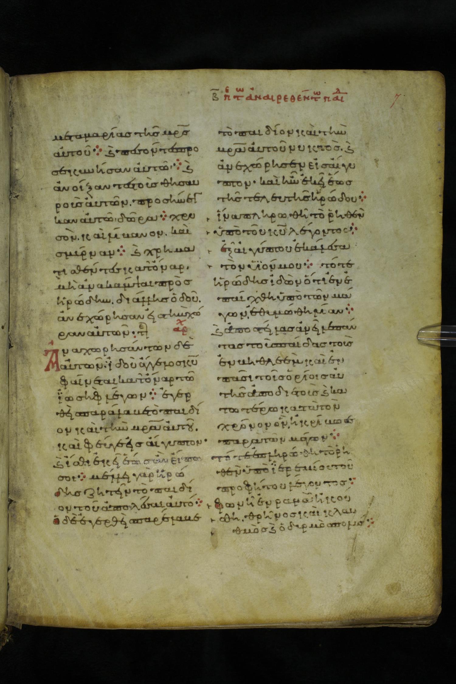 Eleventh century minuscule of the Gospels on parchment; 219 leaves, 2 columns, 26 lines per column. Images were taken at the National Library of Greece in Athens.