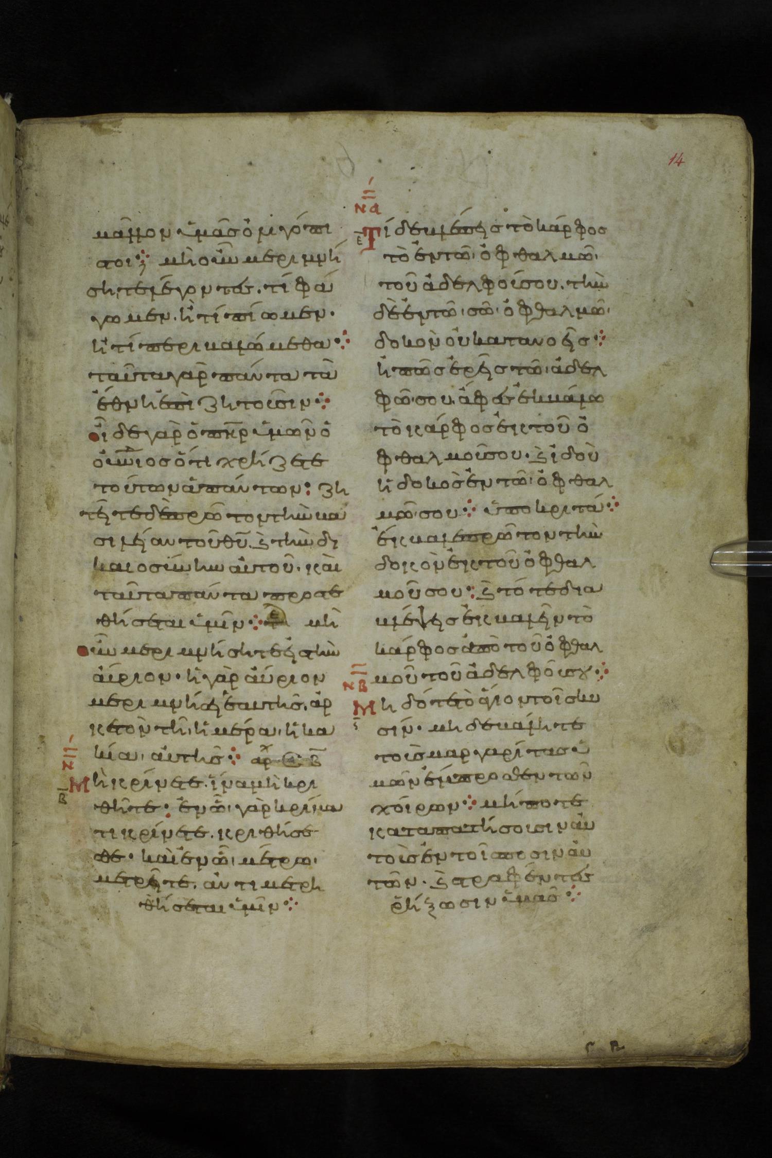 Eleventh century minuscule of the Gospels on parchment; 219 leaves, 2 columns, 26 lines per column. Images were taken at the National Library of Greece in Athens.