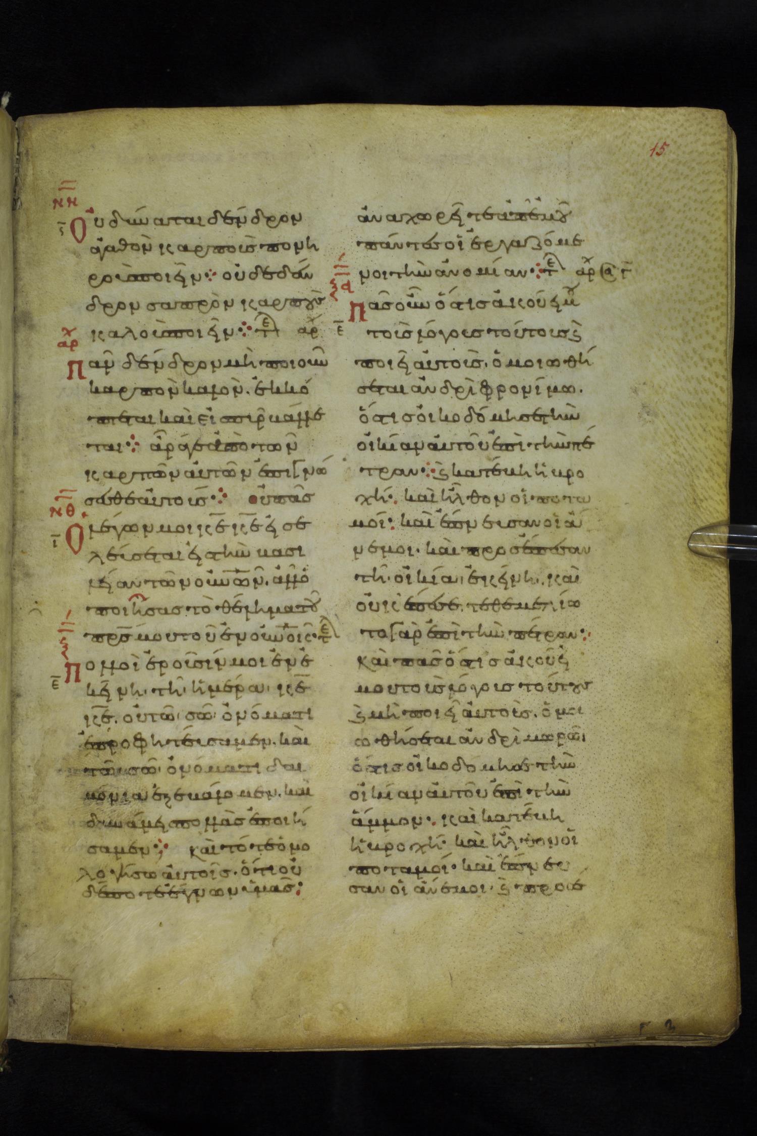 Eleventh century minuscule of the Gospels on parchment; 219 leaves, 2 columns, 26 lines per column. Images were taken at the National Library of Greece in Athens.